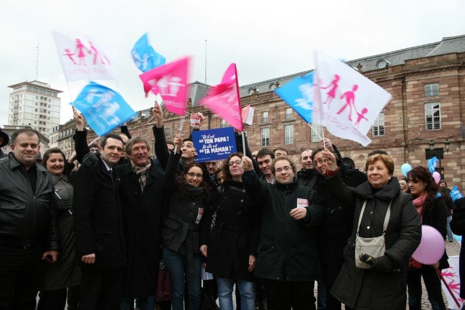 Mais, Jean-Emmanuel Robert versus Fabienne Keller, c’est aussi le RPR versus l’UDF, la droite versus le centre-droit. Si l’ancien maire de Strasbourg n’hésite pas à brandir dans ses discours l’étendard de la lutte contre l’insécurité, comme Jean-Emmanuel Robert, lui se « revendique d’une droite assumée, mais moderne ». Il est à ce titre opposé au droit de vote des étrangers aux élections locales et contre le mariage pour tous. Présent à la « Manif pour tous » à Paris en janvier, il était encore ce samedi place Kléber pour dire « non à la PMA (procréation médicalement assistée) pour les couples de même sexe ». Une position qui « n’est pas que théorique, mais prend racine dans [son] histoire personnelle », dans laquelle la question de la filiation est posée.