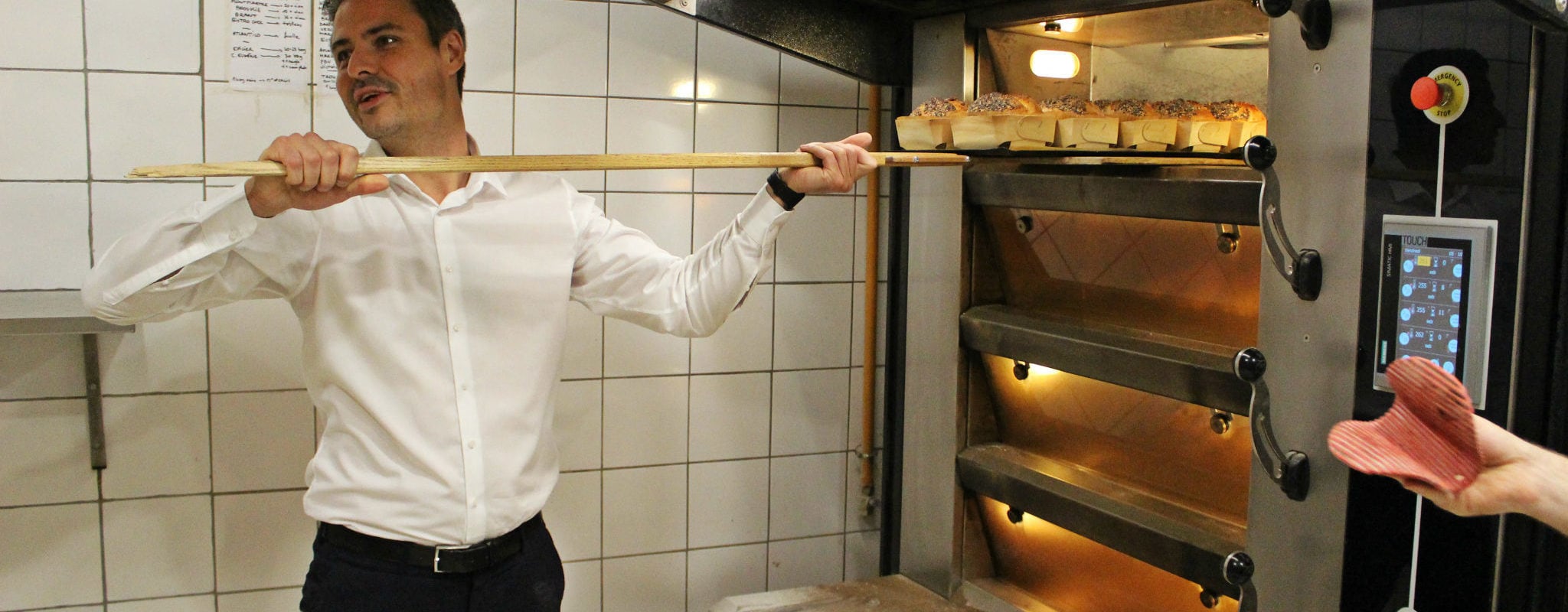Certes, pas de tablier ou de toque pour le conseiller municipal, c’est en chemise blanche immaculée qu’il a enfourné quelques baguettes et viennoiseries. La première étape d’un « marathon de 24h ». Une manière aussi de rappeler que celui qui agrandi à Colmar est « fils de boulanger ». Manches retroussées à l’américaine, il descend ensuite travailler la pâte des viennoiseries au sous-sol.