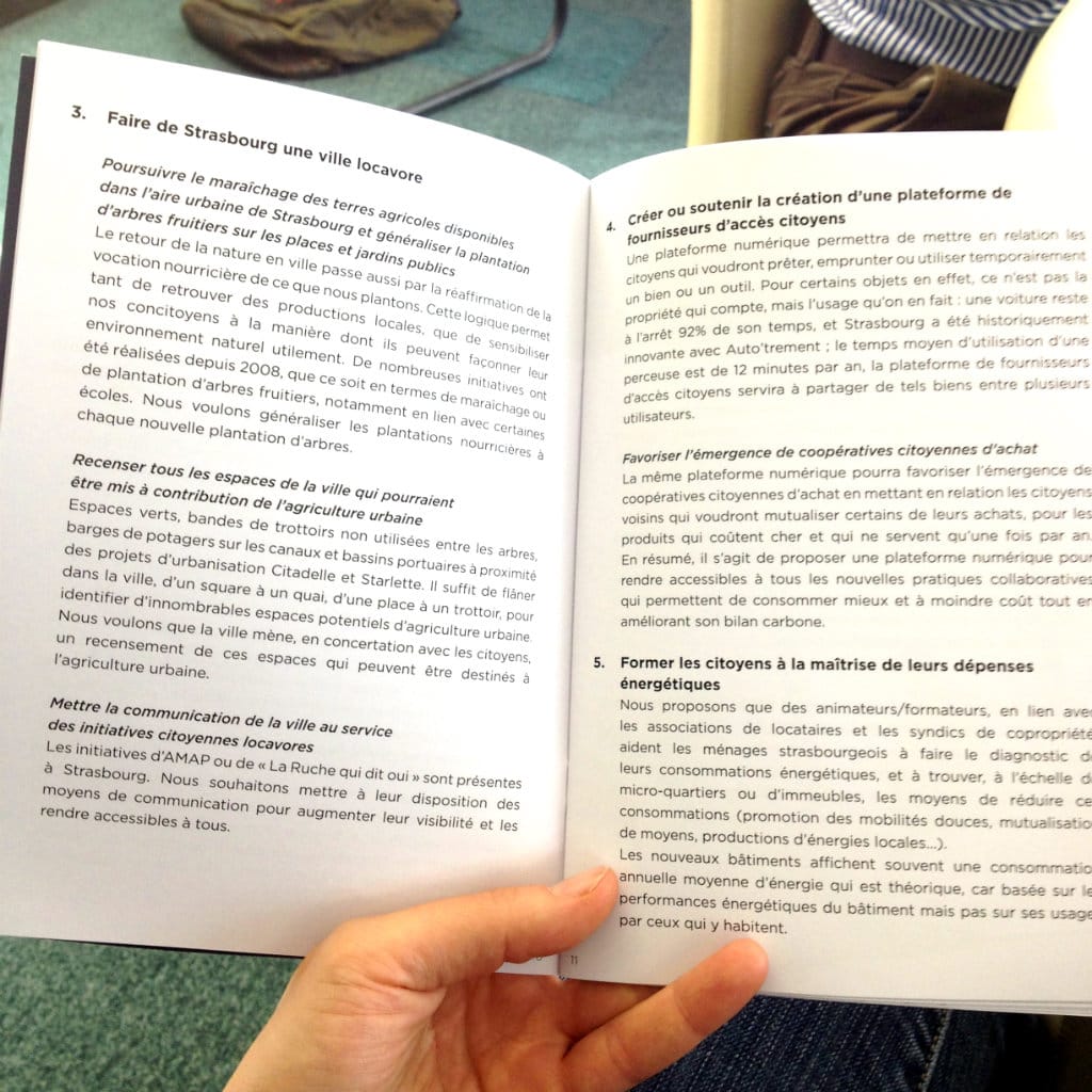 Utilisation des friches, réhabilitation des locaux de la Coop pour en faire un centre d’art et d’économie numérique, augmentation du rythme des constructions à 4000 logements par an et mise en place d’un plan de lutte contre l’insalubrité dans le parc social, mise en place de « mini-grids », des réseaux électriques par pâtés de maisons, capables d’équilibrer la consommation d’énergie entre bâtiments passoires thermiques et bâtiments passifs voire positifs (qui produisent plus qu’ils ne consomment, comme la tour Elithis), réseau de troc entre voisins, etc. Ces propositions sont variées et ne seront pas toutes, loin s’en faut, bien accueillies ou comprises par les élus et militants.