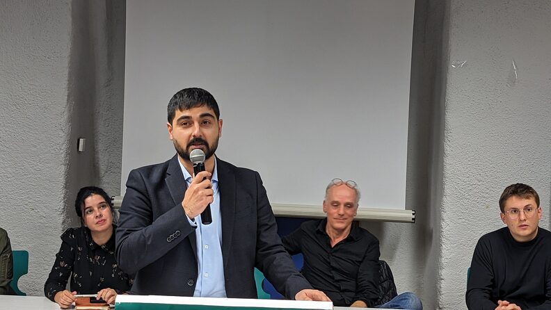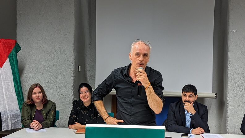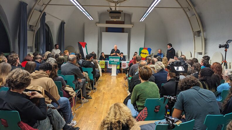 Plus d’une centaine de personnes se sont pressées dans la salle de la Maison des associations de Strasbourg, agrémentée des couleurs de la Palestine et de la Kanaky, lundi 8 décembre vers 19 h. Elles et ils sont venus écouter Philippe Poutou, ancien ouvrier syndicaliste de l’usine Ford de Blanquefort en Gironde et ancien candidat à l’élection présidentielle pour le Nouveau parti capitaliste (NPA). Désormais conseiller municipal à Bordeaux, il est venu soutenir Cem Yoldas, le candidat pour les élections municipales en tête de la liste « Strasbourg c’est nous ».