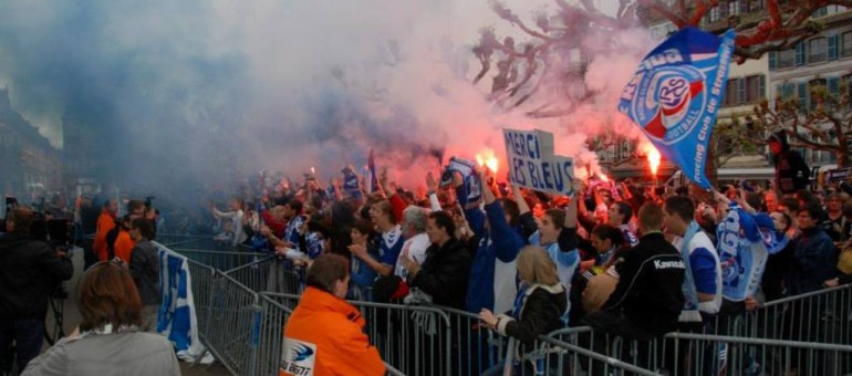 On arrive sur place à une heure du coup d’envoi, fixé à 16h30. Le contingent strasbourgeois est divisé en deux : tribune Paysagère pour les uns, gradins Wassmer pour les autres. Pour accueillir les hordes de sauvages que nous sommes, les CRS sont sur le pied de guerre. Et comme on est vraiment des animaux, pas besoin de prévoir les commodités nécessaires. Quatre toilettes de chantier pour 3 000 fans, le ratio est confortable. Mention spéciale aussi pour les sandwiches infâmes et le prix des boissons.