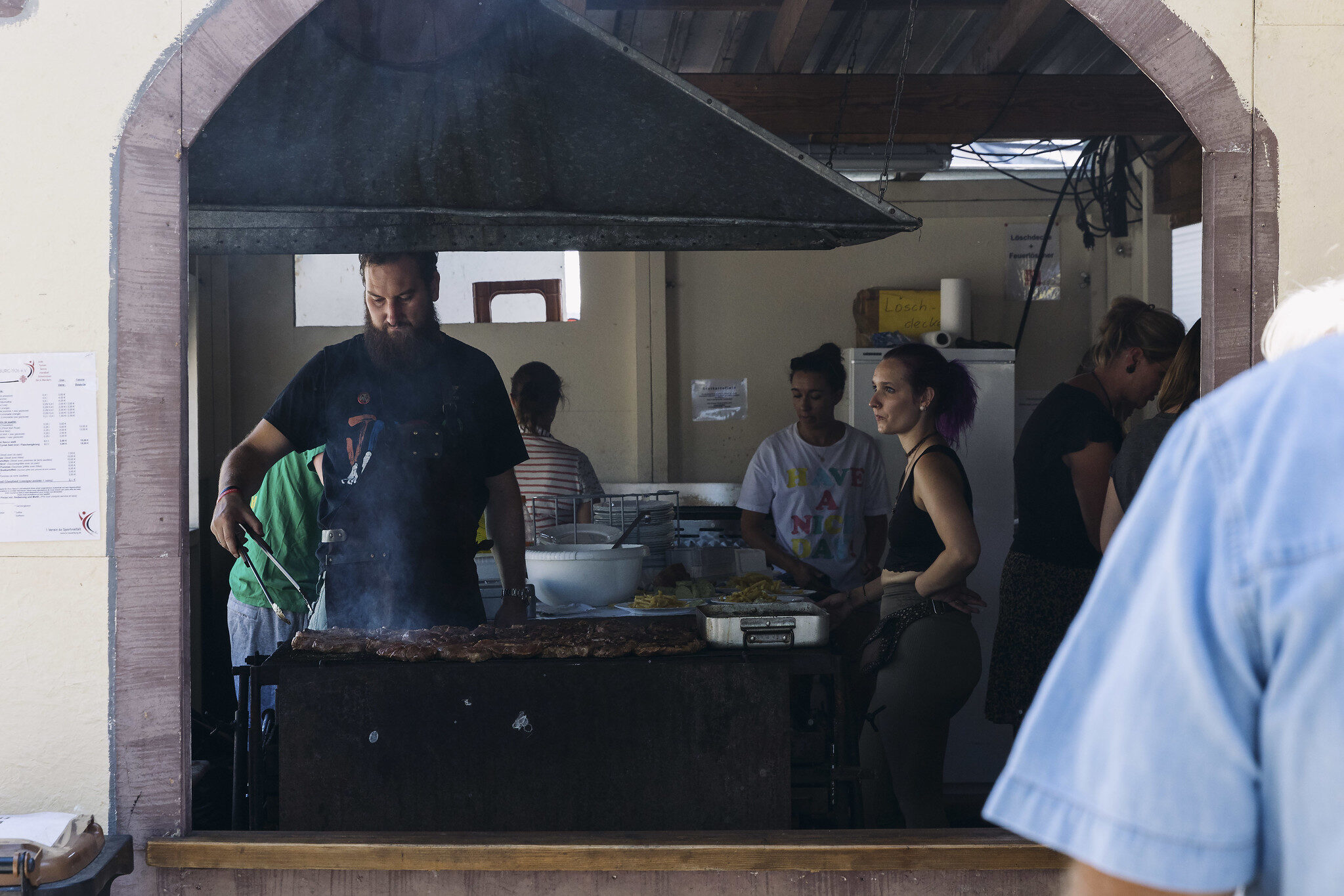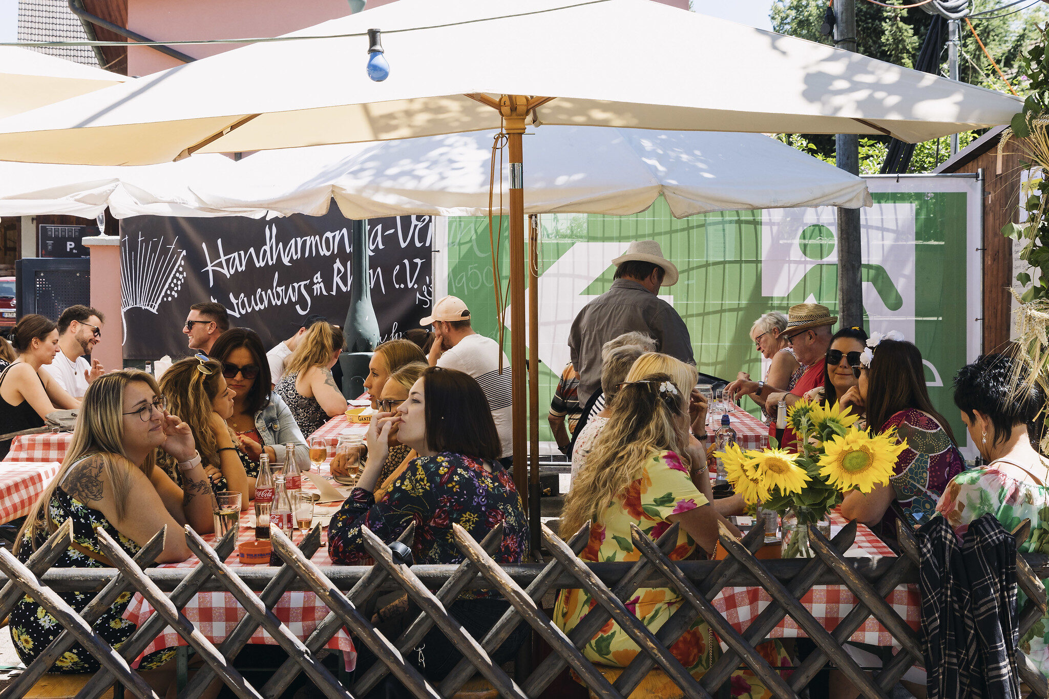 À y regarder de plus près, il est vrai que tous ceux qui servent des frites et des saucisses, qui slaloment entre les tables, qui suent devant leurs fourneaux, sont des bénévoles de clubs sportifs. Le TV Neuenburg 1926 propose des grillades, le FC Neuenburg, tout en couleur jaune criarde, sert des « Gyros box » (box kebab) et des « Schupfnudeln » (sortes de gnocchi allemands)… On déguste des bières sur des tables hautes, grâce au FC Auggen, un club de foot voisin.