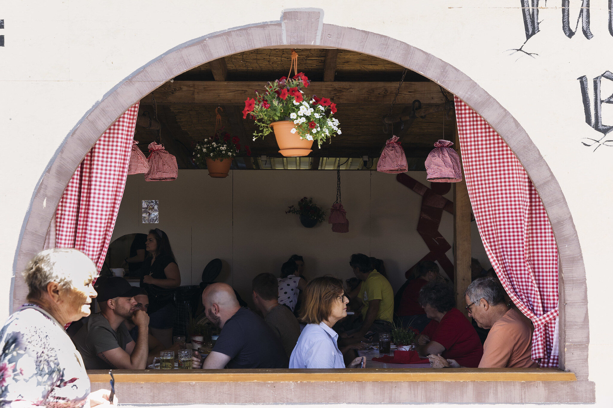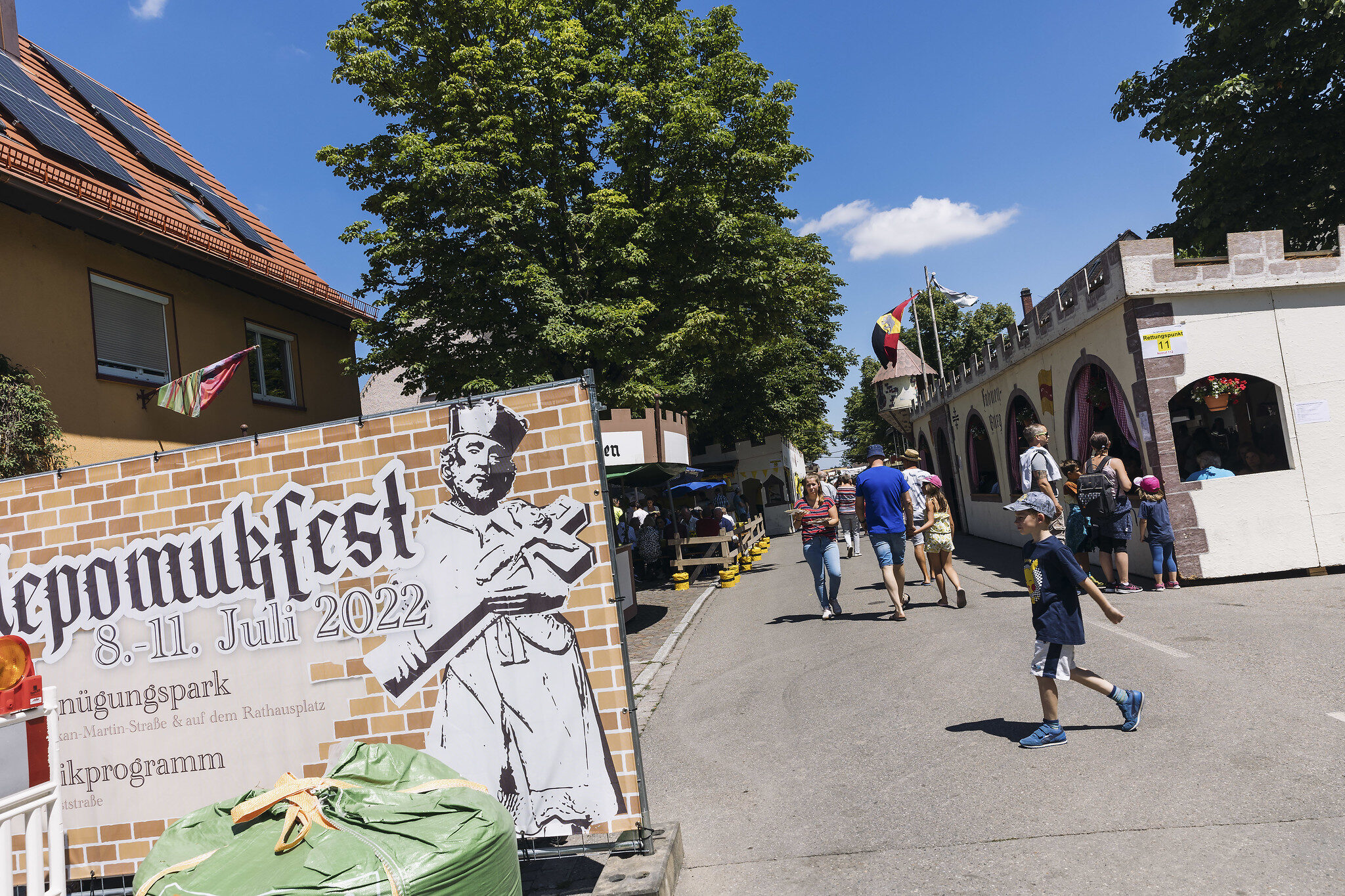 Des buvettes et terrasses sont entourées de faux « remparts » et d’étendards qui rappellent les tournois de chevaliers. Cette année, seules deux rues de cette ville de 12 000 habitants située en face d’Ottmarsheim sont dédiées à la Nepomukfest.