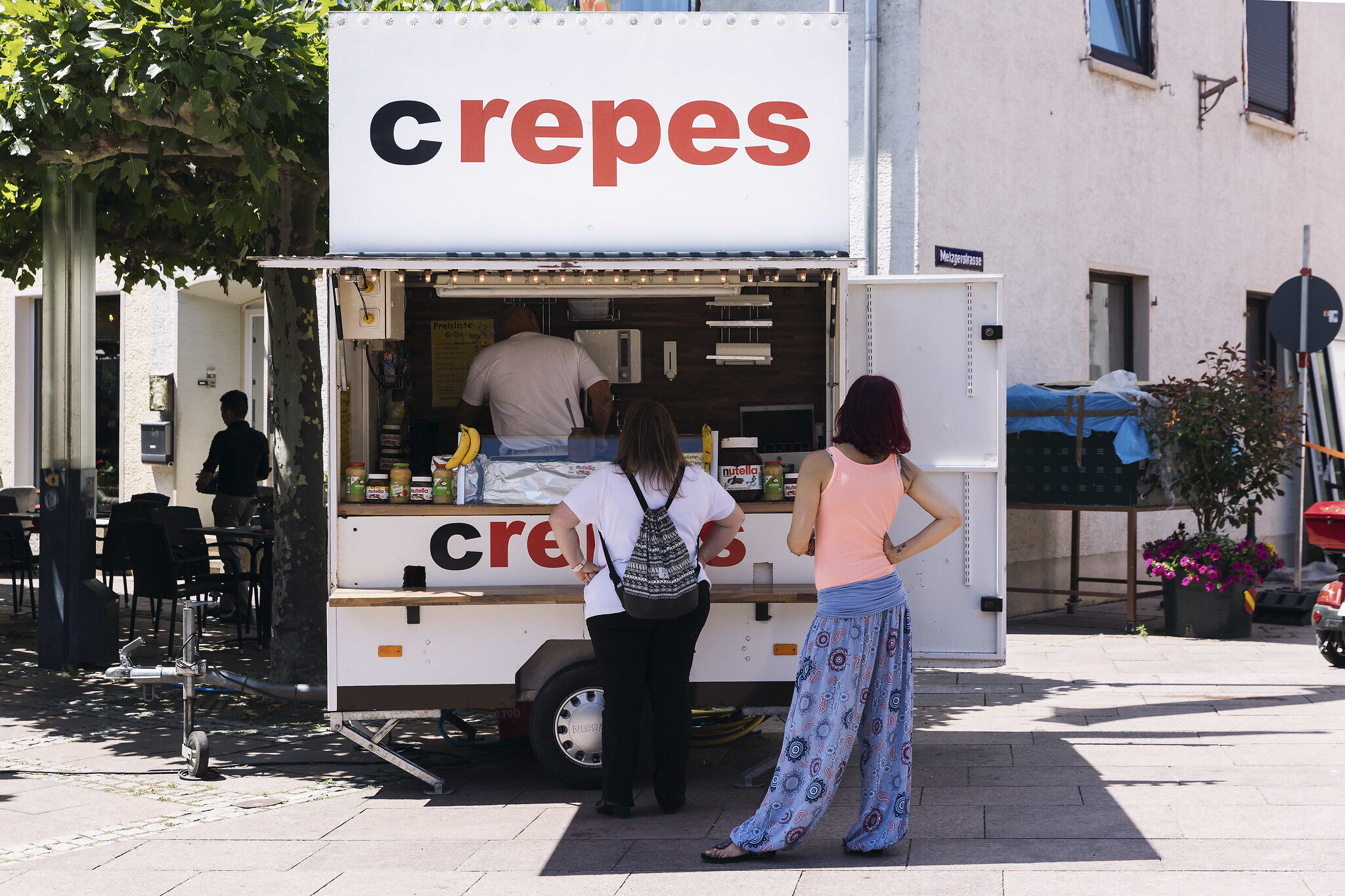 Avec ses camarades, ils logent à Weil-am-Rhein (ville allemande frontalière à Bâle) pour un « work trip » de quelques semaines. Leur entreprise y a son siège européen. Aujourd’hui, ils sont venus à Neuenburg pour retrouver Phil, un collègue allemand qu’ils connaissent depuis une dizaine d’années. Pour eux, cette fête de rue est le parfait prétexte pour prendre un bain de folklore allemand : « ça ressemble un peu aux « county fairs » (foires locales) qu’on peut avoir chez nous, sauf qu’aux USA, on ne mange que des choses frites », note Joey. « Ici, on apprécie beaucoup la currywurst, les Spätzle, les merguez… ».