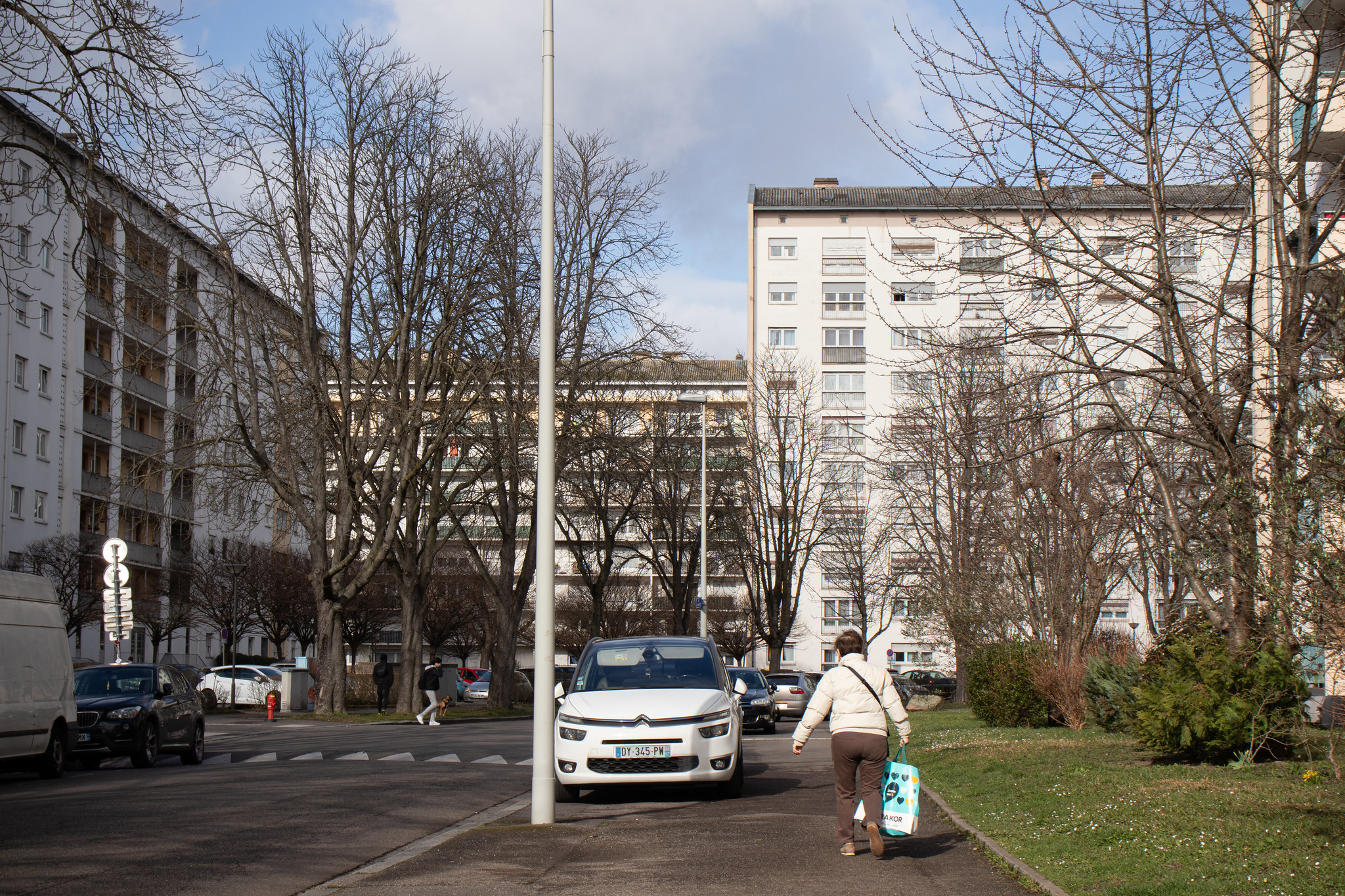 L’ensemble « Les Kerguelen », situé juste à côté de l’immeuble des Sabah, évoque plutôt l’autre nom de cet archipel méconnu de l’océan indien : les « Îles de la Désolation ». Les façades sont délavées, un peu de linge qui sèche aux fenêtres y met de la couleur. Les quelques arbres font pâles figures à côté du béton. Sur le parking entre les deux blocs, Annie (le prénom a été changé), fonctionnaire bientôt à la retraite, rejoint la petite troupe. Elle attend qu’une voiture passe la prendre pour faire les courses. Elle a le temps de discuter un peu, et partage les mêmes peurs que Saliha :