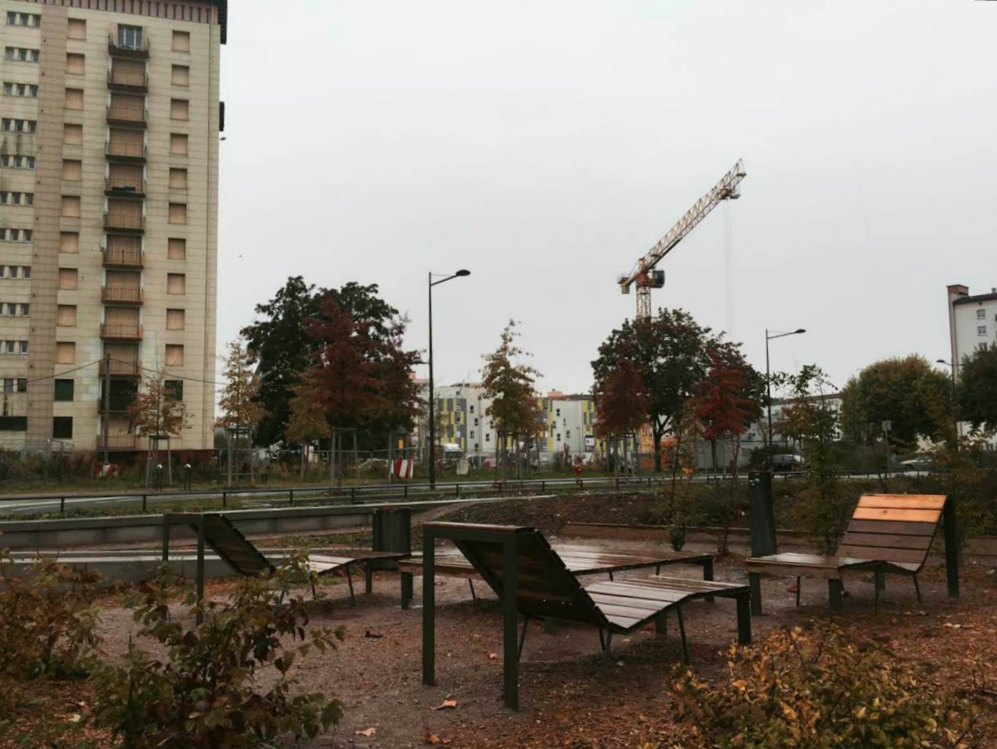 Malgré les gouttes, certains petits téméraires s’attardent sur les aires de jeux installés à quelques mètres. D’autres empruntent les allées piétonnes qui mènent jusqu’aux immeubles entourant la place. Un peu plus loin, des voitures roulent au ralenti sur des chaussées rétrécies et avancent jusqu’au centre médico-social.
