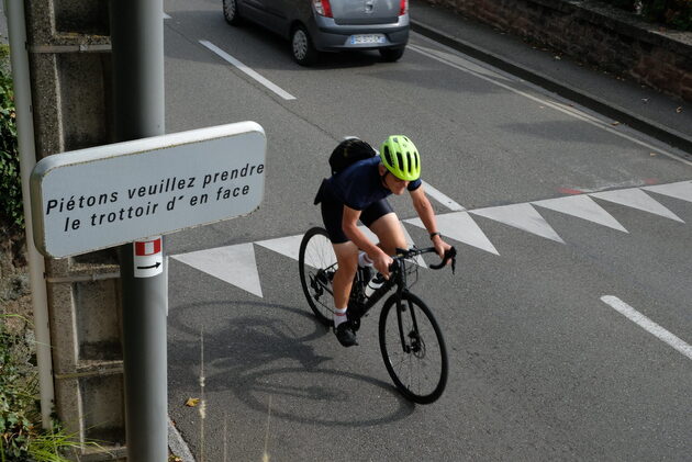Rue de la Victoire, le trottoir d’un côté est si étroit qu’un panneau enjoint les piétons à traverser. « La largeur de la rue de la Victoire empêche toute piste cyclable », estime le maire de la commune. Bernard Fischer avance aussi que la rue se situe dans une zone à 30 km/h, qui permet une « circulation apaisée ». Concernant la rue des Bonnes gens, il estime qu’elle sera intégrée dans le prochain plan vélo, de 2025 à 2028.