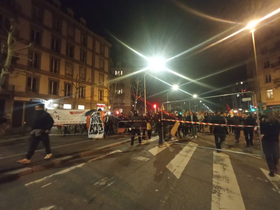 Peu avant 19h, le cortège s’élance, guidé par des fumigènes, empruntant un itinéraire non-déclaré auprès de la Préfecture. Place de la République, les manifestants crient leur colère devant la façade de cette institution exécutrice de la force d’État.