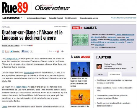 A la suite de la condamnation en appel de l’écrivain Robert Hébras à un euro symbolique de dommages et intérêts et 10 000 euros de frais de justice pour avoir mis en doute le caractère forcé de l’enrôlement d’Alsaciens dans les Waffen SS, Rue89 revient sur les relations compliquées entre Alsaciens et Limousins. Car le 10 juin 1944, une soixantaine d’hommes de la division blindée SS Das Reich massacre la population d’Oradour-sur-Glane faisant 642 victimes, et parmi les 60 hommes sous l’uniforme allemand, il y avait 14 Alsaciens, des « Malgré-nous« …