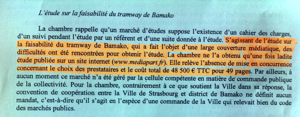 Mais à la différence de la mouture « CUS » du rapport de la Chambre régionale des comptes, la version « ville de Strasbourg » qui sera débattue en conseil municipal ce lundi après-midi examine « certains marchés ». Et notamment celui de l’étude sur la faisabilité d’un tramway à Bamako (lire le PDF de cette étude, mis en ligne par Mediapart en 2012), qui fait l’objet depuis octobre 2010 d’une information judiciaire à Nancy, pour « favoritisme » et « recel de favoritisme ». Ce que dit le rapport à ce sujet :