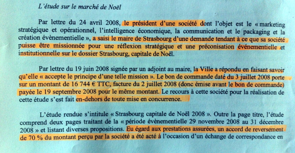 Dans la mouture « ville » du rapport de la CRC, on trouve aussi plusieurs paragraphes concernant la fameuse étude sur le marché de Noël, commandée et payée rubis sur l’ongle en début de mandat pour… trois pages de texte ! Si la Ville a exigé le remboursement de 70% de la facture, la CRC relève l’absence d’accord sur l’échelonnement de ce remboursement, tout comme elle pointe dans ce cas aussi, le défaut de mise en concurrence lors du passage de commande de cette étude.