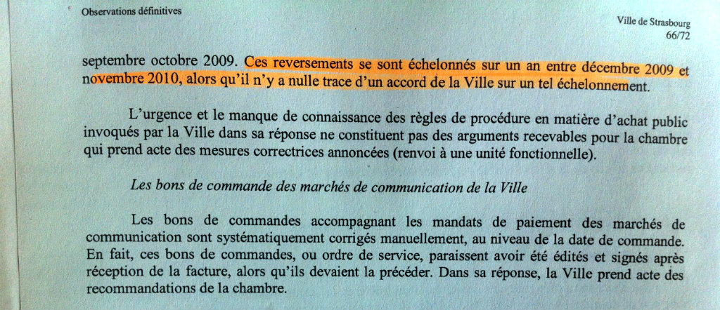 En plus du coût de l’étude, près de 50 000€ pour 49 pages, la CRC critique « l’absence de mise en concurrence concernant le choix des prestataires », au nombre de trois. A cela, la Ville rétorque que cette étude ne rentrait pas dans le cadre des marchés publics puisqu’elle était commandée pour le compte d’un tiers (la ville de Bamako). Que nenni, juge la CRC, rien dans la convention passée entre Strasbourg et la capitale malienne ne faisait mention d’une étude sur la faisabilité d’un tram – le fameux « mandat ». Selon Mediapart, qui révélait l’affaire en février 2012, le maire de Strasbourg n’aurait pas souhaité verser 50 000€ de subventions au Mali pour réaliser cette étude, « comme c’est l’usage en matière de coopération internationale », car, toujours selon Mediapart, « le maire explique avoir eu quelques doutes sur l’utilisation qui pouvait en être faite« .