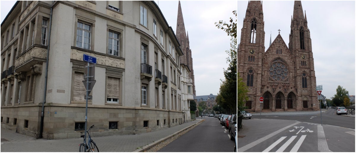 Le site où se rejoignent les quais aux noms de ces deux familles rivales, dont les luttes ont provoqué une guerre civile à Strasbourg dans les années 1330, est jugé vers 1880 comme « le plus beau terrain de construction de la Neustadt ». Si spectaculaire qu’en venant de la vieille ville, Saint-Paul et son style néogothique s’imposent de toute la hauteur de leurs deux flèches de 76 mètres.