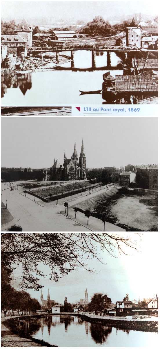 Avant 1880, l'île abrite des chantiers navals et des jardins (Doc. "Il était une fois Strasbourg, vestiges disparus", Roger Forst) ; vers 1900, construction progressive de l'axe Vosges-Forêt-Noire (Archives Strasbourg) ; le quai Müllenheim début XXème (Doc. Roger Forst)
