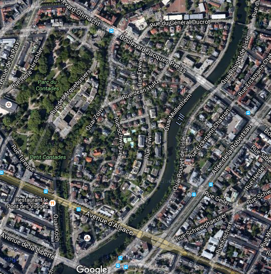 L’île Sainte-Hélène aujourd’hui, entre l’Ill, à droite, et l’Aar, à gauche (Google map)
