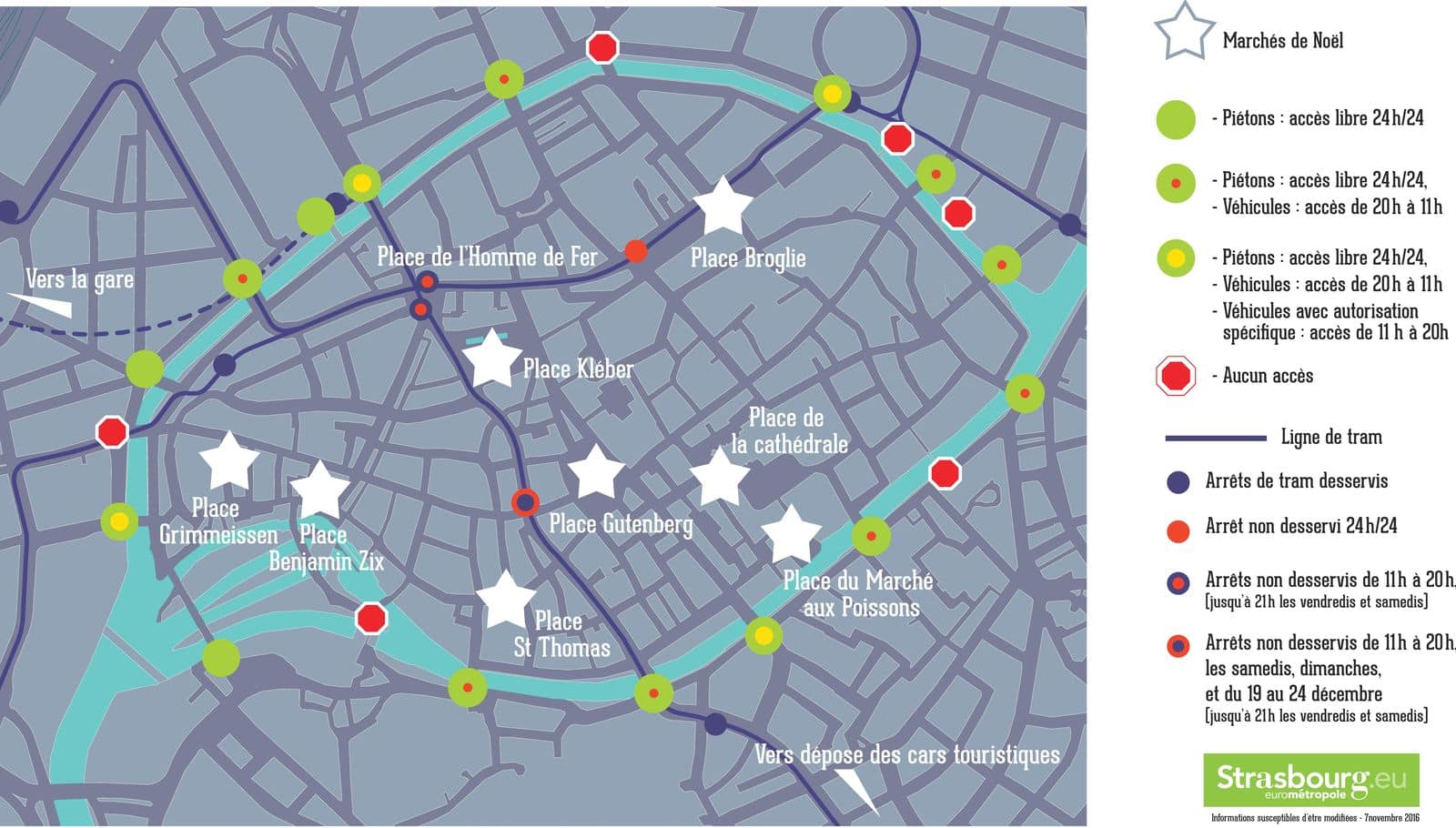 Du vendredi 25 novembre au samedi 24 décembre, le centre-ville de Strasbourg sera la zone la plus sécurisée de France. En nombre de policiers au mètre-carré en tout cas, l’édition 2016 du Marché de Noël est probablement en train d’inscrire un record. Chaque pont de la ville est transformé en « checkpoint », certains pour les véhicules et d’autres uniquement pour les piétons. Dans tous les cas, les cyclistes devont mettre pied à terre pour les franchir.