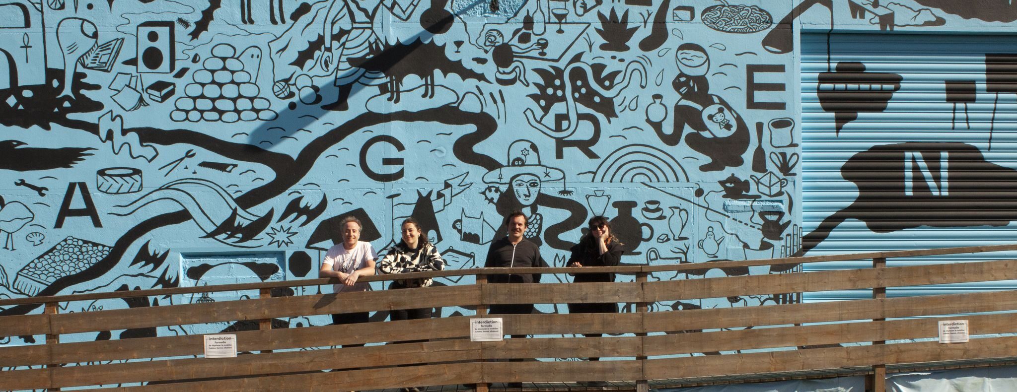L’équipe de La Grenze devant la fresque réalisée par Basil Bibas : François Freundlich, Elise Grob, Thibaut Philipp et Julie Goulon Photo : doc remis