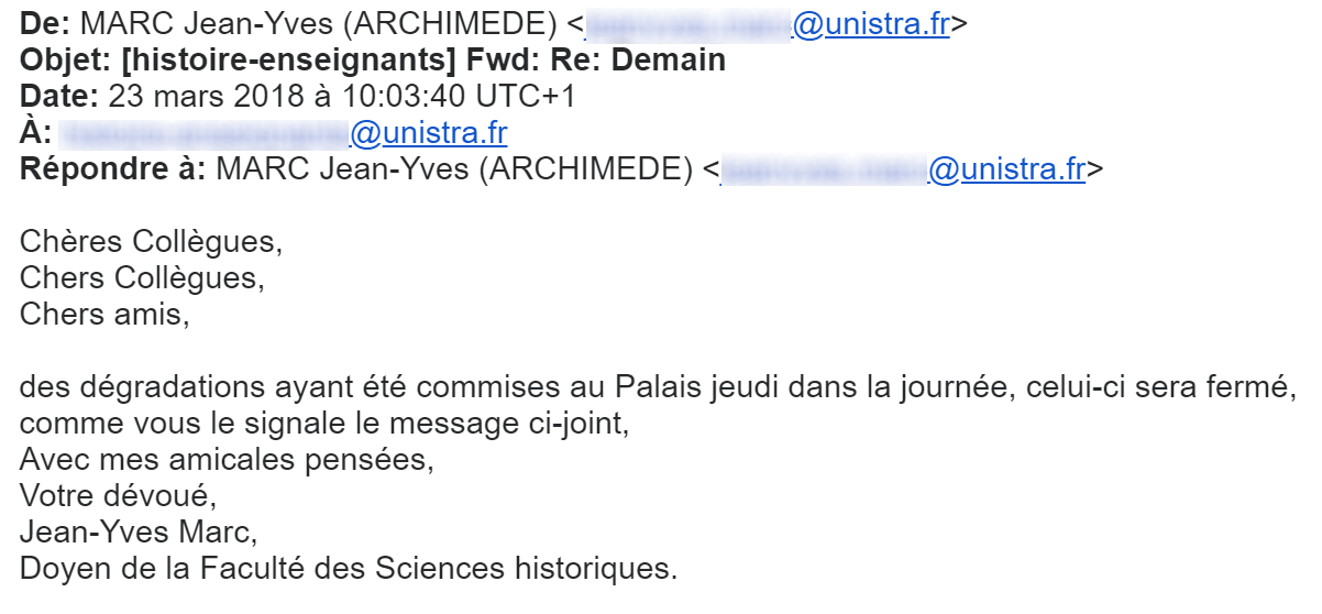 « Fake news » à la fac d’Histoire ! Vendredi 23 mars, le doyen de la faculté des Sciences historiques, Jean-Yves Marc, envoie un e-mail aux professeurs de son établissement. Il y affirme que des dégradations ont été commises lors de l’occupation du Palais Universitaire par des lycéens et des étudiants opposés à la réforme de l’accès à l’université le 22 mars. Entre 50 et 70 étudiants se sont installés dans la salle 119 depuis 10h30, rejoints par environ 200 personnes à partir de 16h30. L’Université a octroyé des salles et réorganisé les cours qui devaient s’y dérouler durant la journée, tout en indiquant aux étudiants qu’ils devaient avoir libéré les locaux à 20h.