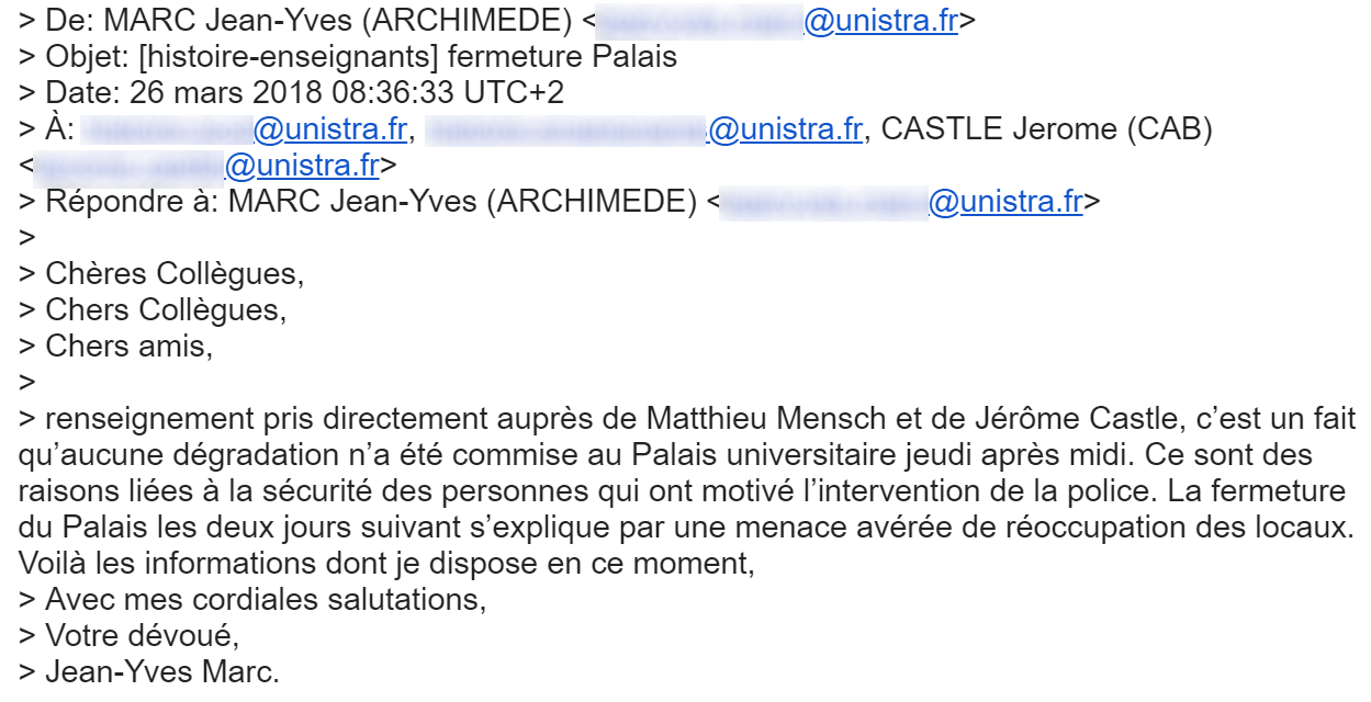 Mais le 26 mars, Jean-Yves Marc envoie un second e-mail dans lequel il assure finalement : « Aucune dégradation n’a été commise au Palais universitaire jeudi après midi. »