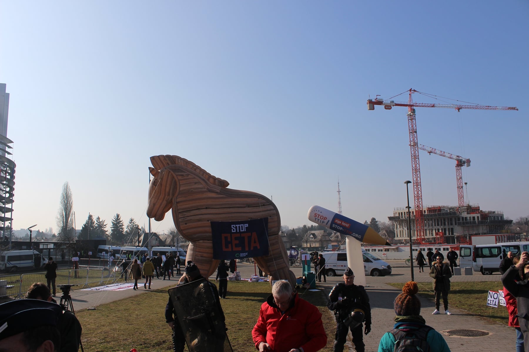 La Ville de Strasbourg a d’ailleurs plus ou moins encouragé cette vocation du Parlement européen à Strasbourg, comme ultime lieu du débat démocratique, en riposte à Bruxelles. Son slogan est même « Bruxelles rime avec technocratie. Strasbourg avec démocratie » (sic !). En février, la municipalité avait mis à disposition deux gymnases pour des manifestants anti-CETA venus de l’Europe entière.