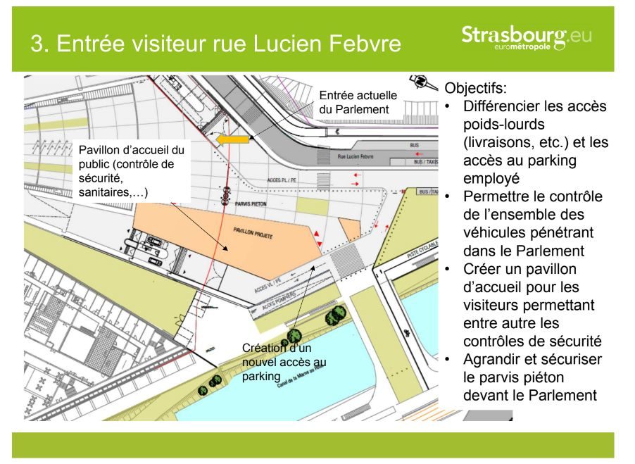 Au-delà des aspects sécuritaires, on comprend dans la présentation de la Ville que l’objectif est aussi de faciliter la vie au Parlement, en différenciant les accès poids-lourds (livraisons, etc.) et employés, en rognant sur l’espace public donc. Les poids lourds passeront par l’entrée actuelle et les véhicules légers par une nouvelle entrée, en descendant sur une future route côté du canal de la Marne au Rhin.