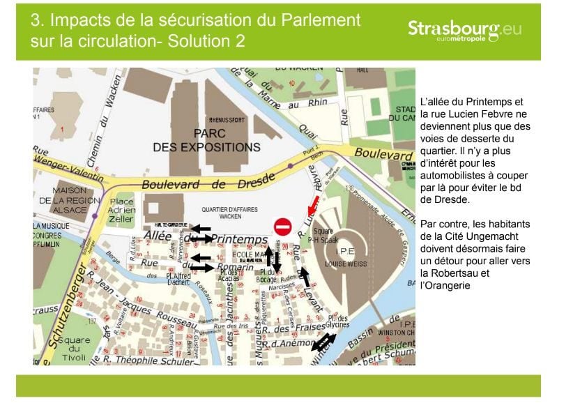 Comme le souligne la présentation, cela obligera parfois les habitants à faire des détours lorsqu’ils iront vers la Robertsau et l’Orangerie. Alors que la question des déplacements vers et dans le futur quartier d’affaires Wacken/Archipel a plusieurs fois fait débat, cette contrainte non-prévue à l’origine s’ajoute. Néanmoins, un parking payant en étages est en cours de construction sur le parking de la piscine du Wacken.