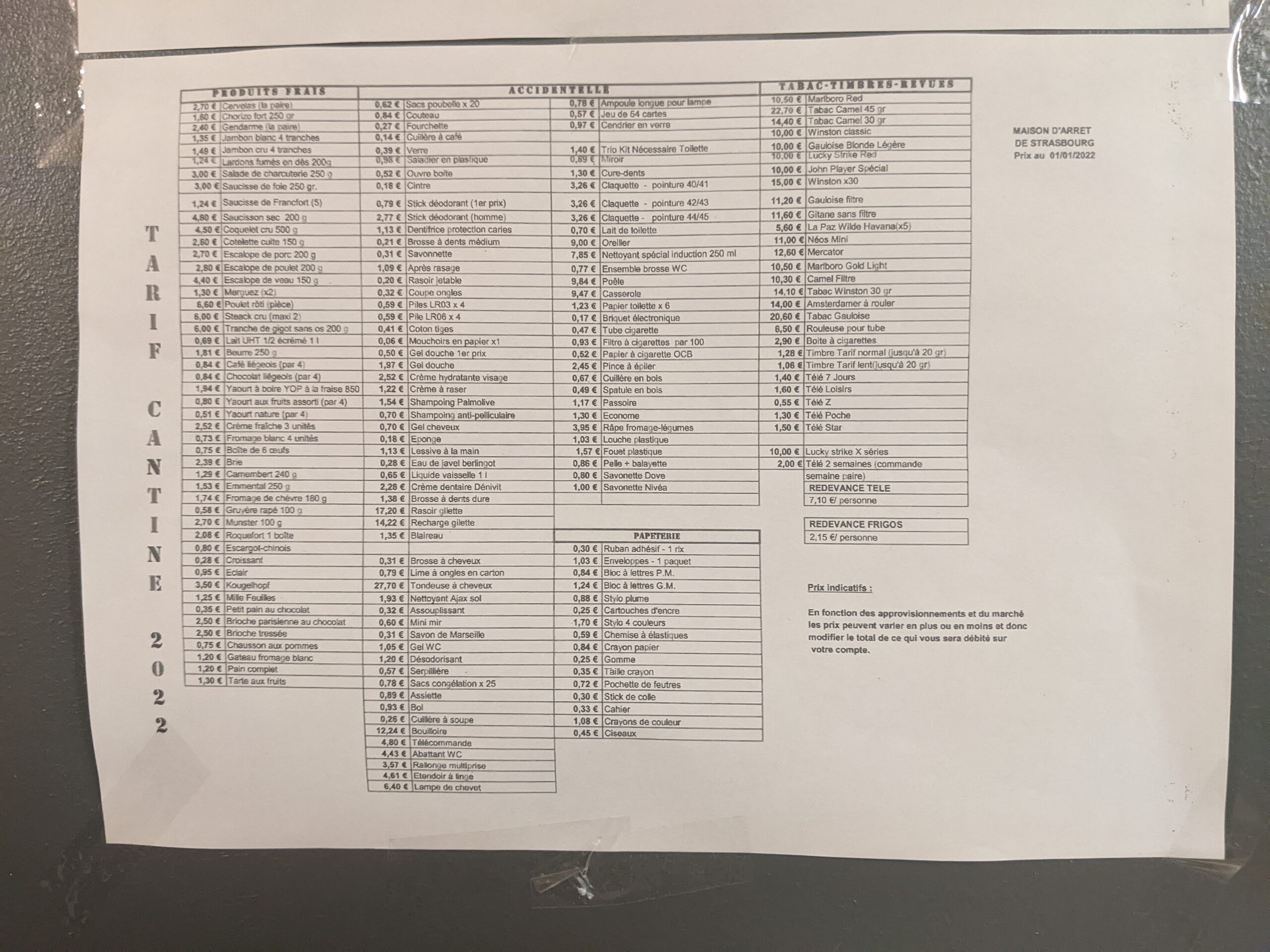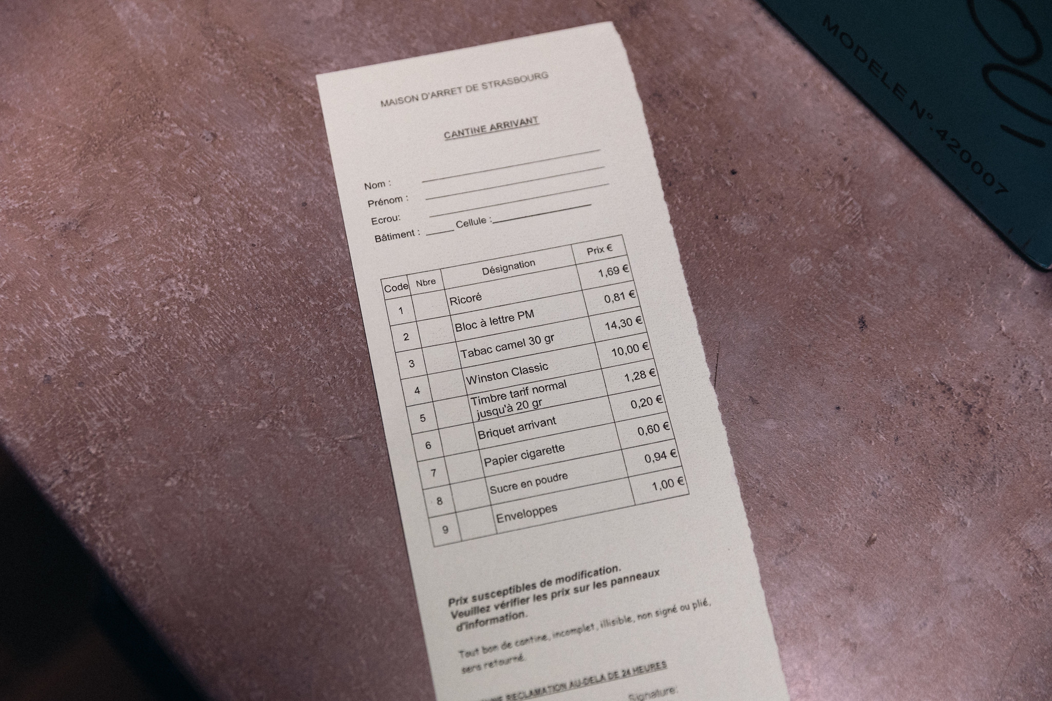 Autre source de mécontentement de plusieurs détenus : le rationnement des cantines. Pour des tarifs bien plus élevés qu’à l’extérieur, les prisonniers peuvent acheter une sélection limitée de produits, de la nourriture à l’eau en passant par le tabac. Ferat se plaint ainsi des restrictions sur l’eau : « T’as le droit à 12 bouteilles par semaine seulement. Pendant la canicule, en trois jours c’est terminé. Dans d’autres prisons, tu peux commander autant d’eau que tu veux. » La qualité des produits laisse aussi à désirer, comme le raconte Kader : « Ça m’est déjà arrivé de recevoir de la viande périmée ou un pot de mayonnaise qui périmait quatre jours plus tard. En plus, les frigos qu’on a sont pourris. Ça m’est déjà arrivé de jeter la moitié de ce que j’avais parce que le frigo avait lâché. »