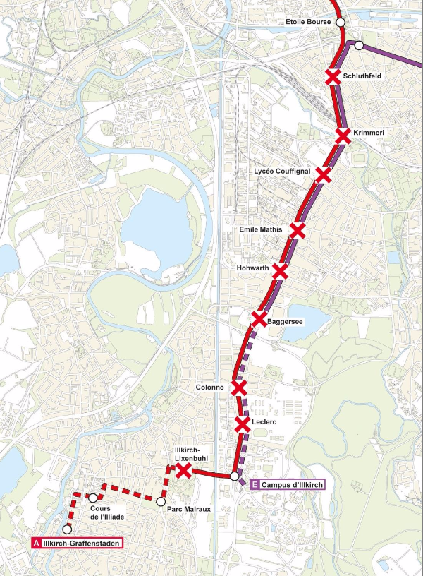 Pendant une grande partie des travaux, du 6 juillet au 30 août, aucun tram ne circulera entre Schluthfeld et Illkirch-Lixenbuhl, le terminus. Ces 10 stations au sud de la ville sont habituellement desservies par les lignes A et E.