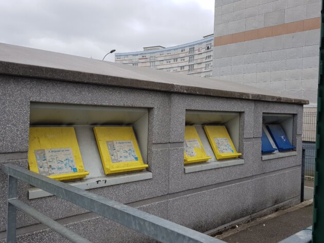 Sur les parkings de ces immeubles d’habitat collectif, les anciens containers de tri sont en effet toujours là. Vestiges d’un passé lointain (personne ne semble se rappeler des dates précises dans la cité). Il y a les couvercles bleus d’un côté, jaunes de l’autre. À tel point qu’un passant pourrait croire que le tri existe toujours. Mais il suffit d’ouvrir les poubelles pour comprendre : tout est mélangé. Des cartons de couches, avec des déchets ménagers classiques, et des canettes de soda. Quelques végétaux aussi. Et aucune notice explicative, comme il en existe habituellement sur les containers de tri.