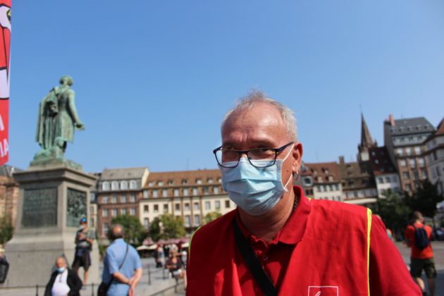 Quelques centaines de personnes ont manifesté à Strasbourg jeudi 17 septembre pour la première manifestation interprofessionnelle depuis le confinement. Autour du camion de la CGT et son orchestre du Prolet Tanz Klub, pas de Jacky Wagner, l’emblématique secrétaire général moustachu de l’Union départementale du syndicat de salariés. L’organisation et les prises de parole, notamment auprès des médias, est revenue à Laurent Feisthauer, un professeur issu de la branche Éducation du syndicat, nouveau secrétaire général de la CGT 67. Un mandat dure trois ans.