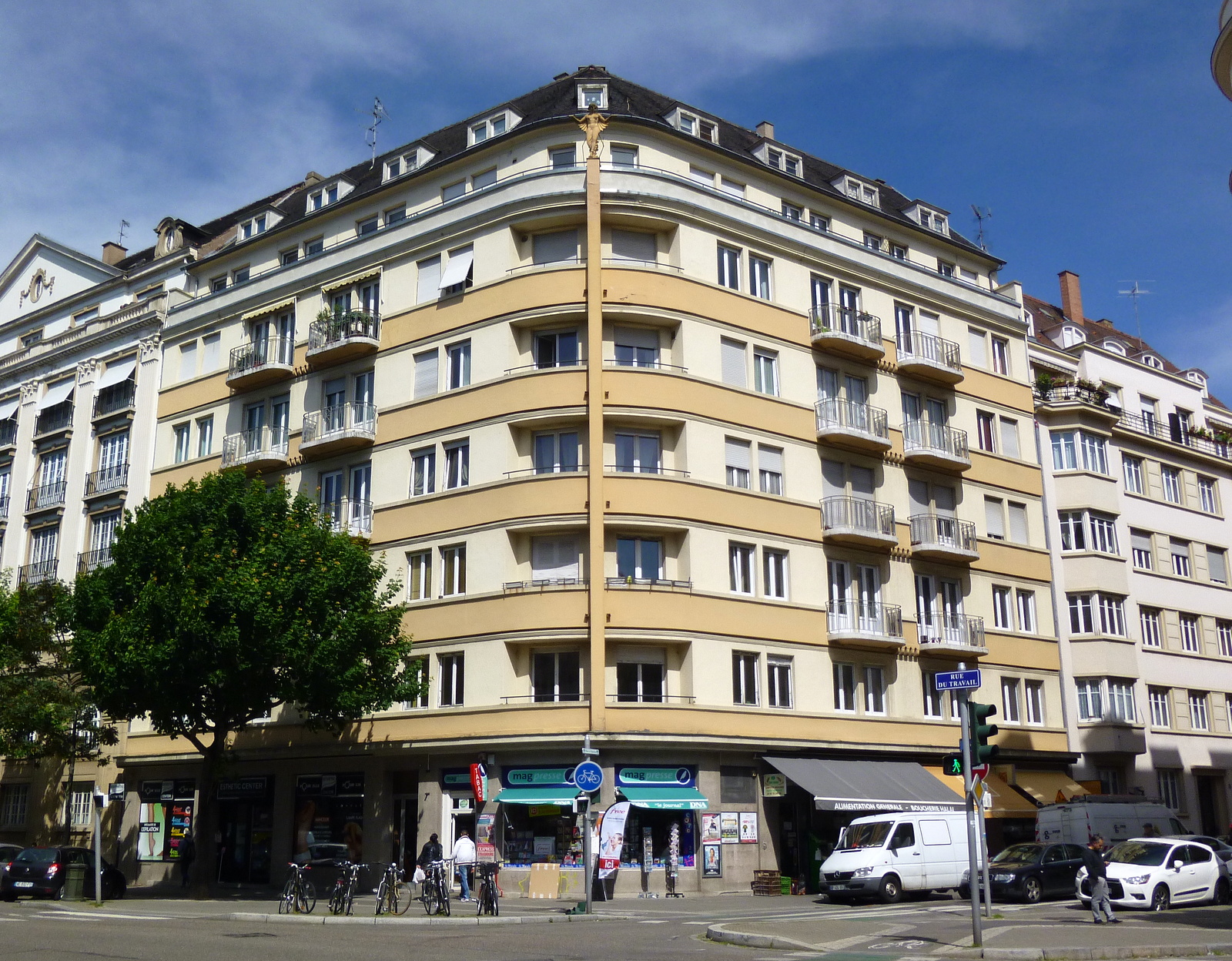Une des difficultés auquel se confronte le promeneur pour identifier les bâtiments Art déco dans Strasbourg réside sans doute là : le style Art déco a beaucoup de variantes. Les bâtiments peuvent tantôt avoir des façades avec des bow-windows à angle droit, des lignes très verticales, comme cet immeuble situé à l’angle de la rue Bouxwiller et de la rue des Bonnes-Gens ; tantôt des lignes plutôt horizontales, des arrondis, comme c’est le cas d’un immeuble à l’angle de la rue du Travail et la rue d’Ingwiller.