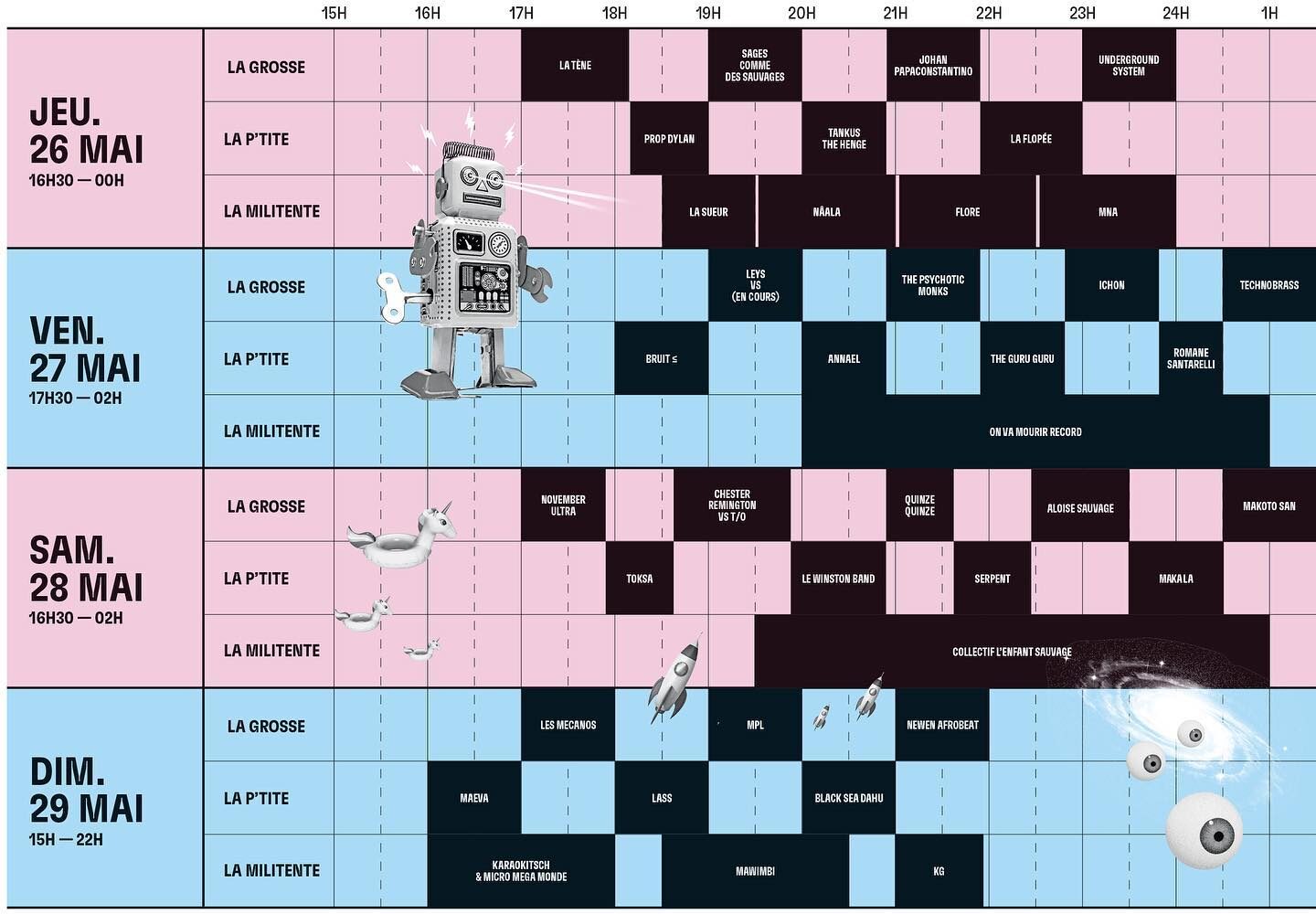 Chaque soirée affiche une dizaine de groupes, qui jouent alternativement sous les deux chapiteaux installés au fond du Jardin des Deux-Rives, splendide écrin sur les rives du Rhin, suffisamment proche de la ville pour y aller en vélo, suffisamment éloigné pour envoyer des mégawatts. Une troisième scène, appelée la Militente, accueille des sets de DJs en continu toute la soirée, ce qui permet de s’échapper si vraiment une formation heurte ses goûts musicaux. Plusieurs collectifs de Strasbourg et du Grand Est ont été invités à prendre en charge la programmation de la Militante, façon cartes blanches.