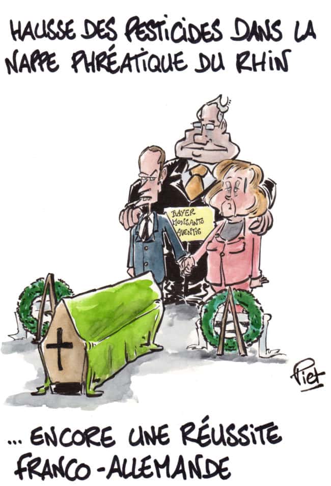 Cette semaine, l’Allemagne a voté pour le renouvellement de l’autorisation du glyphosate dans l’Union Européenne, alors que la France était contre. Mauvais timing, les prélèvements effectués en Alsace dans la nappe phréatique d’Alsace montrent que la présence de pesticides a triplé (celle de glyphosate a augmenté, dans une moindre mesure). Sauf que ladite nappe, une des plus grande d’Europe, s’étend également sous l’Allemagne et la Suisse. Gageons que comme le nuage de Tchernobyl, les épandages allemands auront la courtoisie de s’arrêter à la frontière pour les cinq prochaines années.