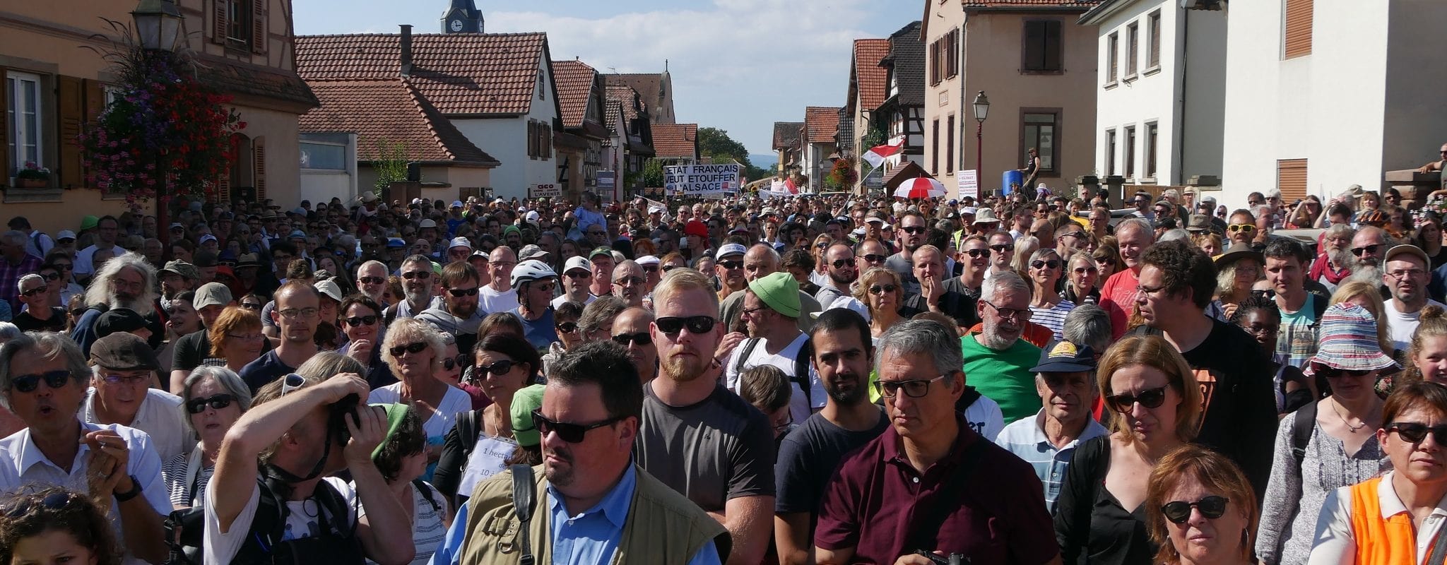 « Résistance ! Résistance ! » Les opposants au GCO ont séché leurs larmes depuis l’évacuation de la ZAD. Ils sont plus de 2 000, selon notre propre décompte, à manifester ce samedi 15 septembre dans le village de Kolbsheim. La veille, le tribunal administratif de Strasbourg a retoqué l’arrêté autorisant l’aménagement d’un viaduc. Il est 14h30. Au-dessus de la foule, quelques drapeaux alsaciens, une pancarte « Je suis Kolbsheim » et des casquettes « Non au GCO ».