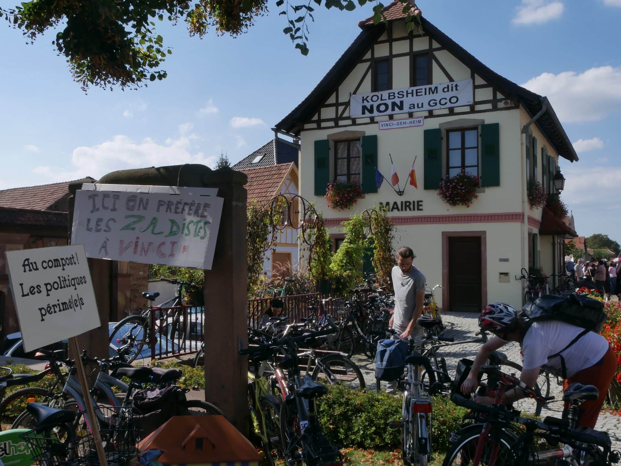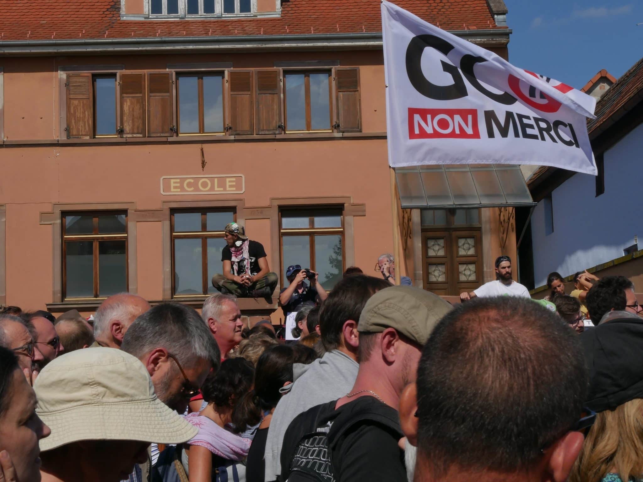 « Résistance ! Résistance ! » Les opposants au GCO ont séché leurs larmes depuis l’évacuation de la ZAD. Ils sont plus de 2 000, selon notre propre décompte, à manifester ce samedi 15 septembre dans le village de Kolbsheim. La veille, le tribunal administratif de Strasbourg a retoqué l’arrêté autorisant l’aménagement d’un viaduc. Il est 14h30. Au-dessus de la foule, quelques drapeaux alsaciens, une pancarte « Je suis Kolbsheim » et des casquettes « Non au GCO ».