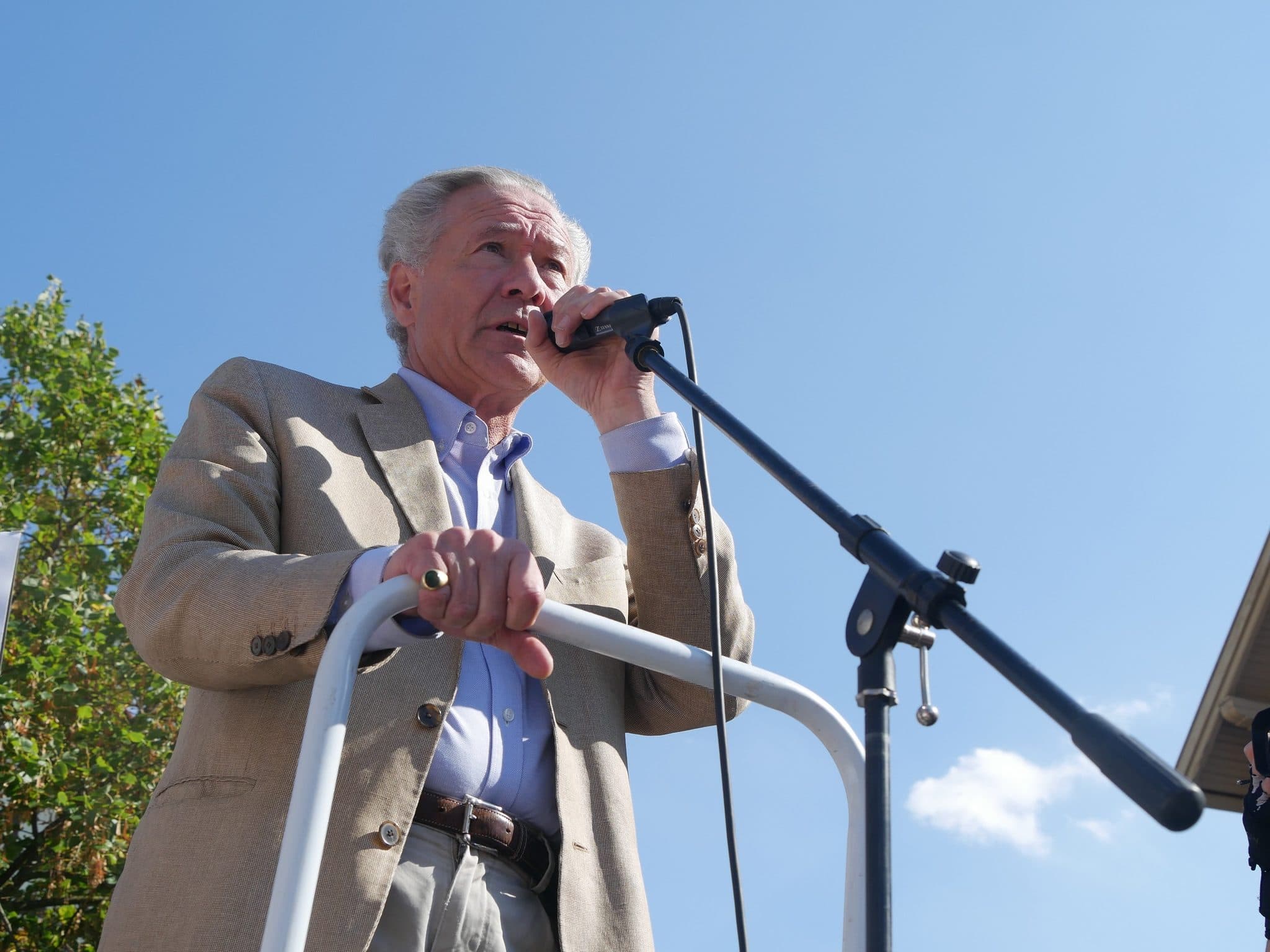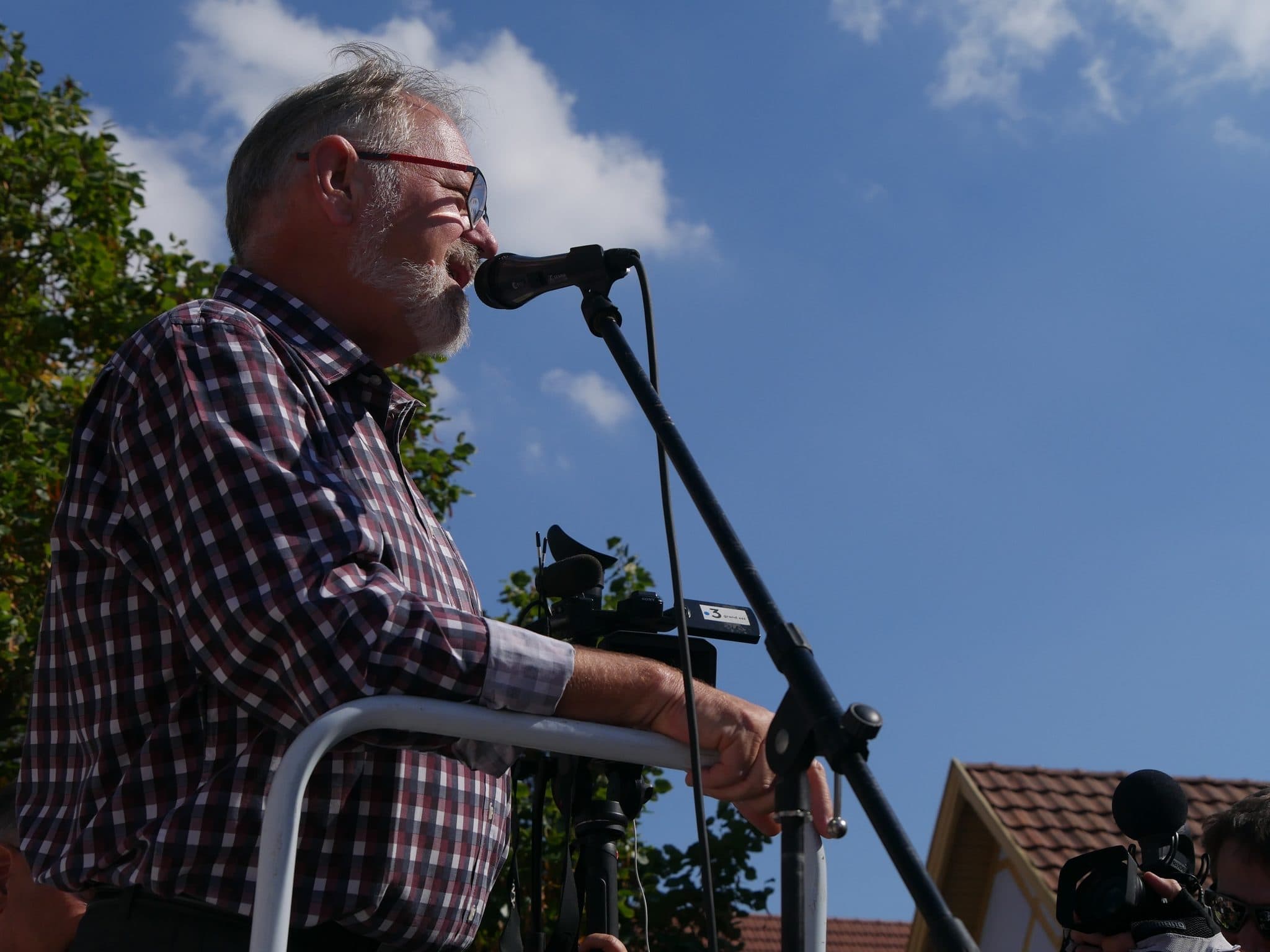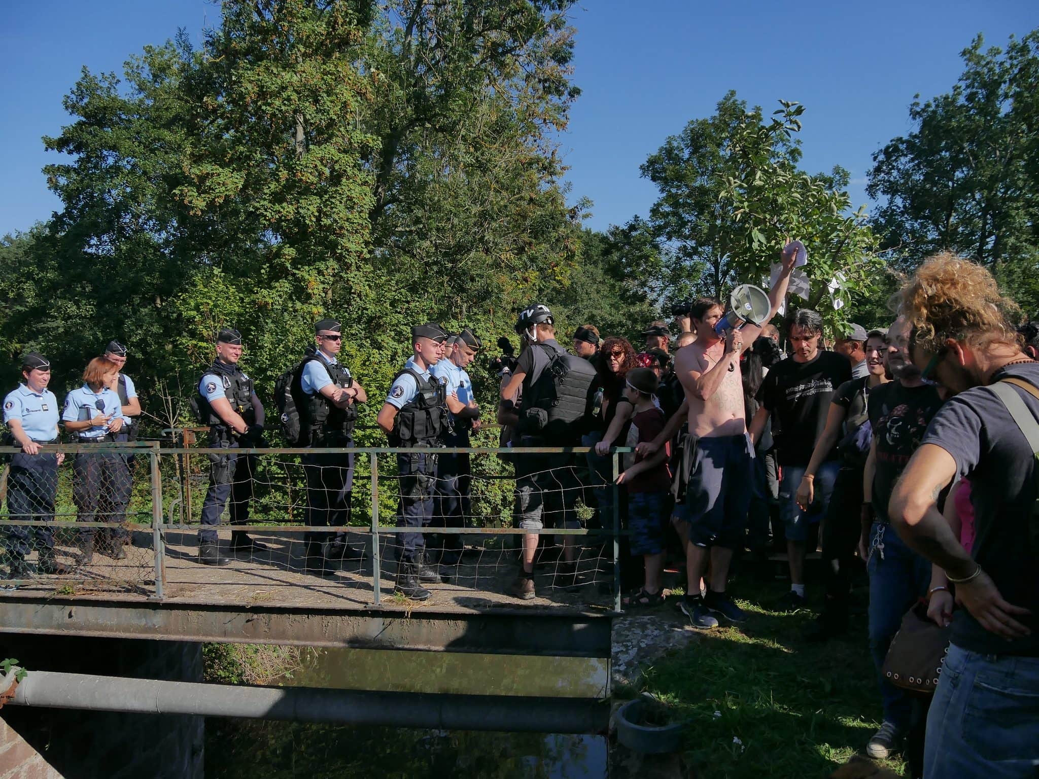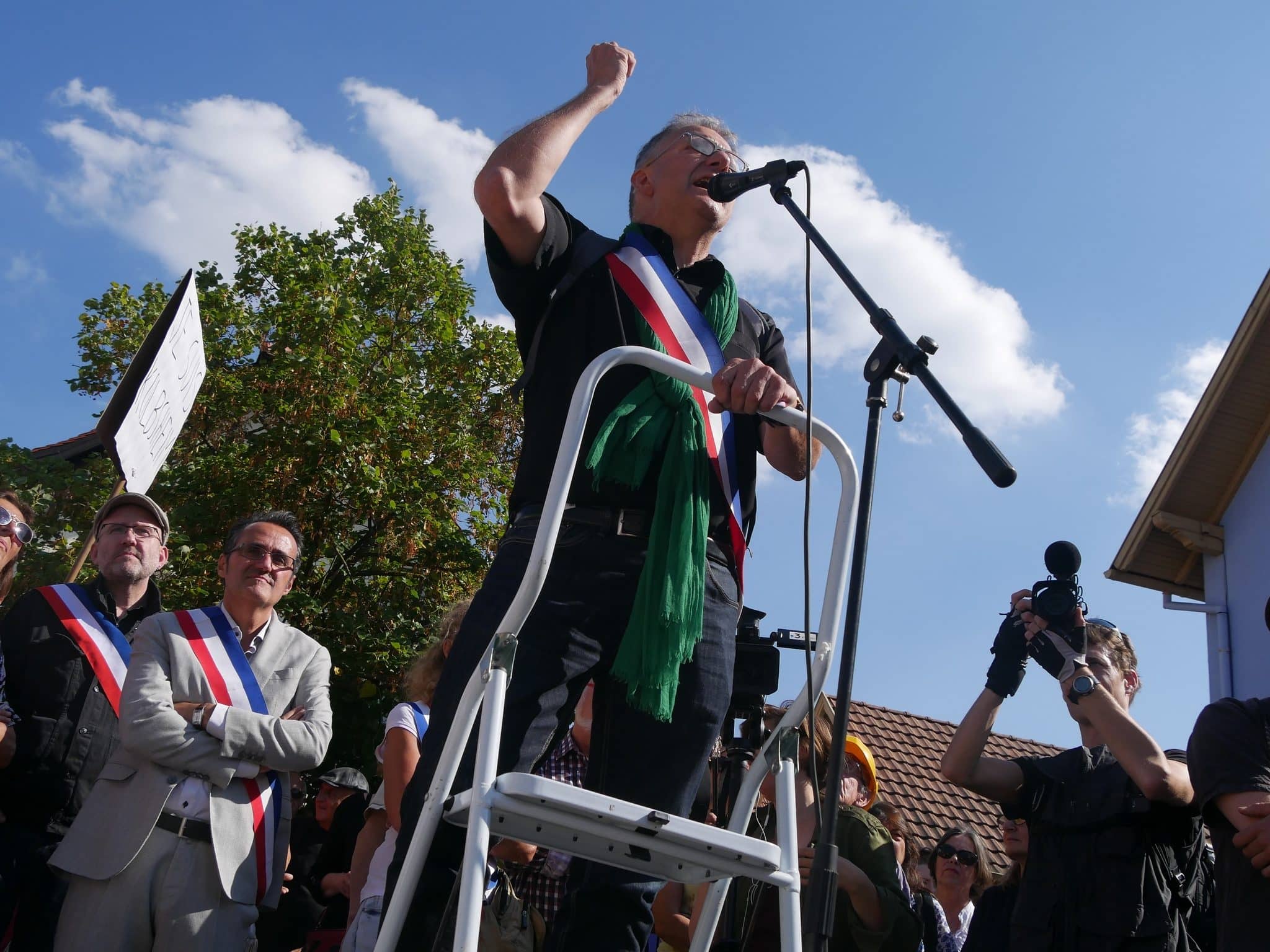 Sur un escabeau, face à un porte-micro branlant, quelques discours s’enchaînent. Le premier fustige « un capitalisme infantile », incapable d’accepter des limites. Vient le discours du maire de Kolbsheim, acclamé. Les manifestants chantent « Joyeux anniversaire » à Danny Karcher pour ses quarante ans de mariage. « Le GCO est un projet encore plus vieux que mon mariage », glisse-t-il. Alain Jund, adjoint au maire en charge de l’urbanisme de la Ville de Strasbourg, encourage les opposants : « On avait la légitimité de nous opposer, maintenant on a la légalité avec nous. » Une représentante du syndicat des avocats de France a demandé de « stopper immédiatement les déboisements en cours. »
