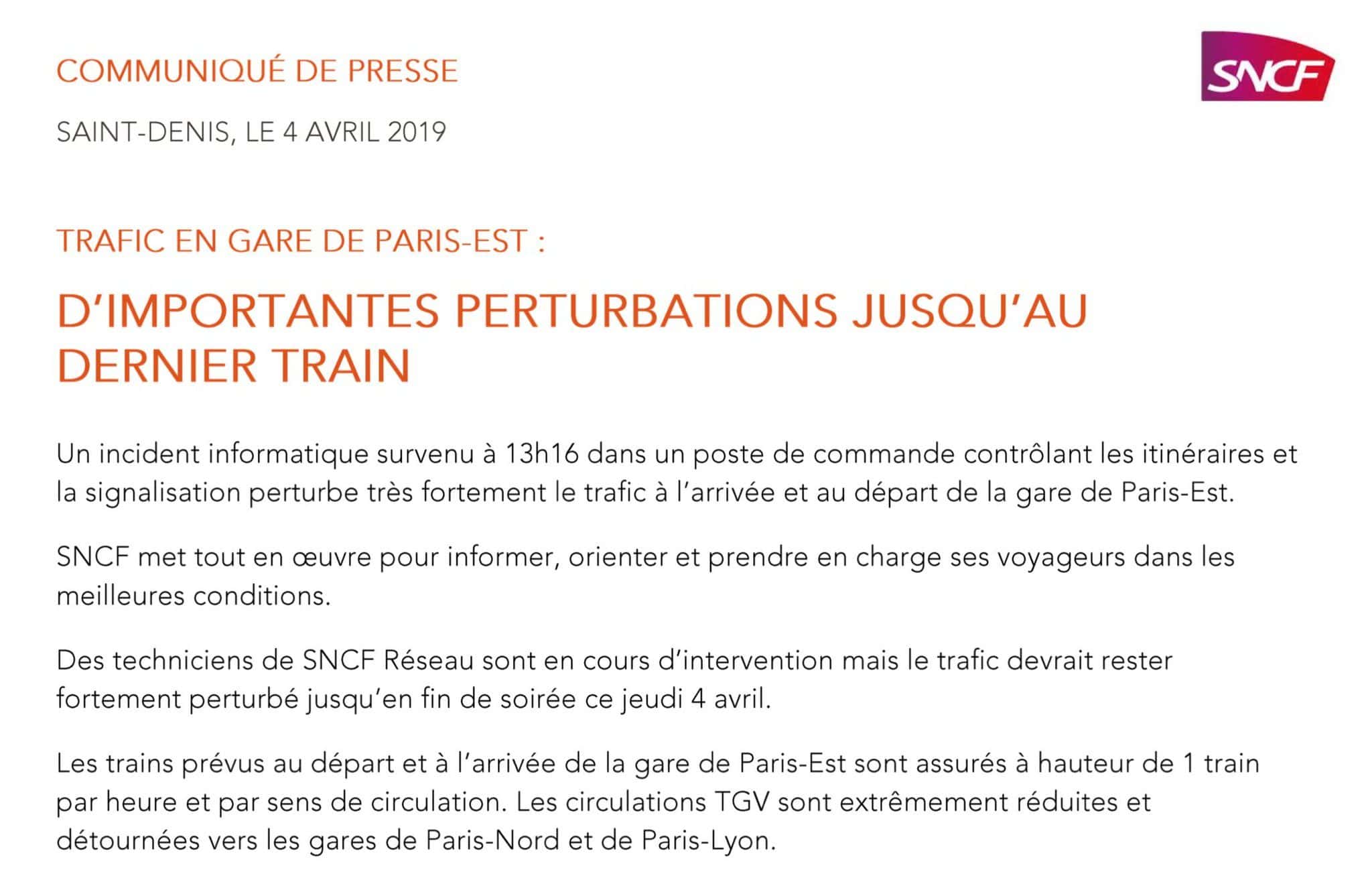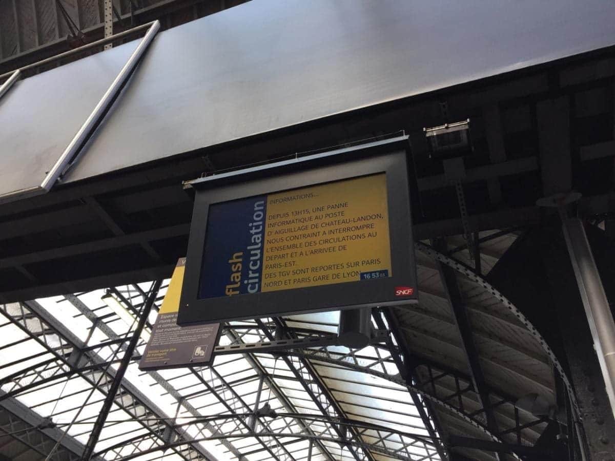 Suite à une panne informatique, la circulation des trains est totalement interrompue au départ et à l’arrivée de la gare de l’Est à Paris depuis 13h40.