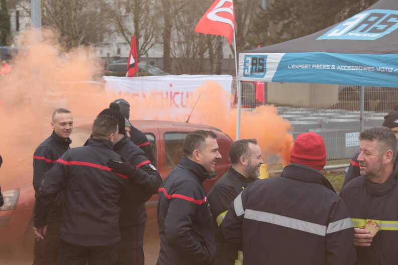 Devant la base logistique du SAMU, dans le quartier de Hautepierre à Strasbourg, la fumée rouge se diffuse, jeudi 23 janvier. Entre deux fumigènes, une pancarte se révèle. « Nos véhicules ne sont pas des salles d’attente ». Devant elle, une soixantaine de pompiers en tenue, rassemblés autour d’un même objectif : une meilleure gestion de l’urgence des situations qui leur sont confiées par le SAMU.