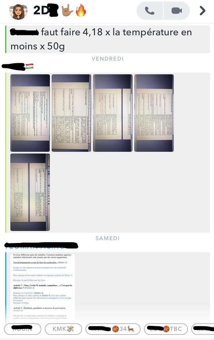 La mère de Giani s’avoue dépassée : « Je ne peux pas faire son boulot, j’ai pas appris ces choses. Ce n’est pas mon monde… » En même temps, qui pourrait « démontrer graphiquement » à sa progéniture « les extremums d’une fonction sur un intervalle », à moins d’être soi-même prof de maths ? Je suis contente de voir que la classe s’est organisée pour s’entraider, comme c’était déjà le cas avant le confinement, grâce à un bon esprit général : ils ont créé un groupe sur le réseau social Snapchat dans lequel ils exposent leurs difficultés.