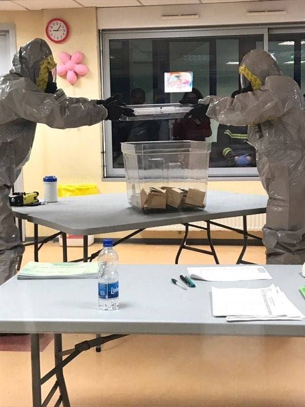 Les pompiers se sont rapidement rendus sur place avec des tenues protectrices et tous les assesseurs et le public ont été confinés dans la cour de l’école pendant que des analyses étaient effectuées sur cette mystérieuse poudre.