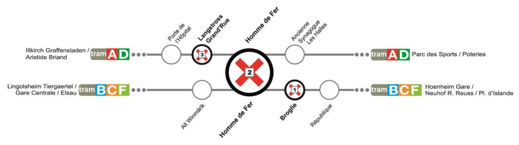 La station Broglie (tram B/C/F) sera fermée du vendredi 25 novembre à 4h30 jusqu’au 24 décembre inclus. Les trams ne marqueront donc pas l’arrêt à cette station. Les usagers du tram sont invités à se reporter sur les stations encadrantes durant cette période (voir schéma ci-dessous).