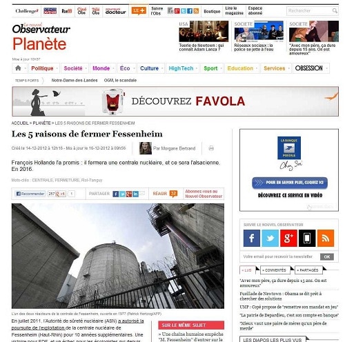 Le Nouvel Observateur repose la question : pourquoi faudrait-il fermer la centrale nucléaire de Fessenheim ? Eh oui, la question de sa fermeture hante le débat sur l’énergie nucléaire depuis tellement longtemps qu’on pourrait avoir perdu les raisons qui plaident pour ou contre. Donc, merci au Nouvel Obs de nous rappeler les fondametaux en cinq point: la question de sa vétusté, sa zone sismique, sa zone inondable, son radier fin et son symbole.