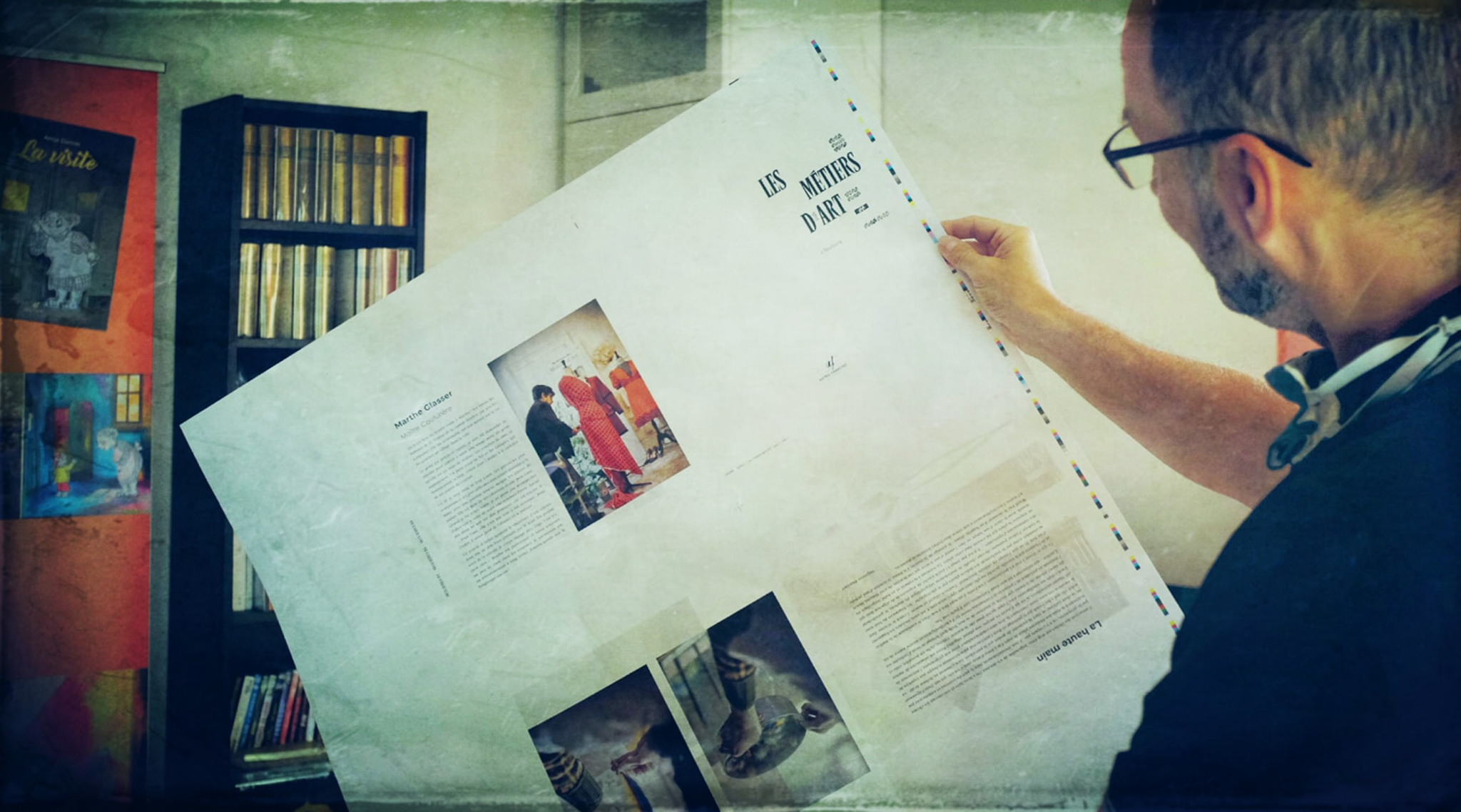 Vendredi 17 mai 2024, 17h. Dans la mezzanine du cinéma le Cosmos à Strasbourg, Olivier Bron s’active. Scotcheuse en mains, l’éditeur fait le tour de l’exposition du dessinateur Blutch. Il fixe un panneau qui commence à se décrocher, replace les livres présentés au public. L’exposition se termine le soir même, tout doit être parfait pour le finissage. « L’édition ça mène à tout. L’autre jour, j’étais aux commandes d’un énorme transpalette pour déplacer des cartons de livres dans un entrepôt. »