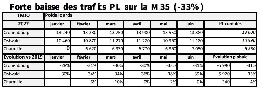 La baisse la plus spectaculaire concerne le nombre de camions sur la M35, qui aurait baissé de 33% en moyenne par rapport à 2019 selon les chiffres de la préfecture, voire jusqu’à -35% en juin à Ostwald au sud. Le trafic poids lourd sur l’A5 allemande n’aurait semble-t-il pas été affecté.