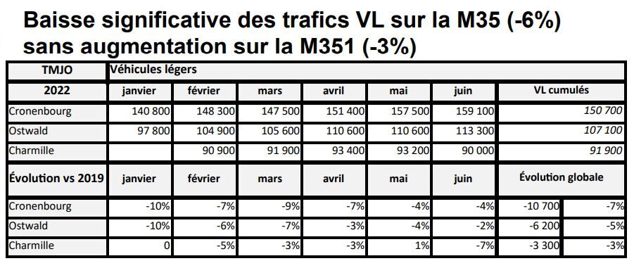 Selon la préfecture, ces mesures combinées ont eu pour effet de délester les autres axes de circulation strasbourgeois. En 2022, il y aurait en moyenne 6% de voitures en moins sur la M35 par rapport à 2019, sans qu’il soit observé de hausse sur l’axe est-ouest d’accès à l’agglomération, la M351 dont la charge baisse légèrement (-3%). Les projections anticipaient plus de trafic sur cette entrée de ville.