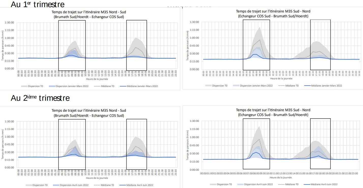 Au final, la préfecture estime que les usagers de la M35 ont gagné 15 à 20 minutes de temps de trajet aux heures de pointe. Selon l’Agence d’urbanisme de Strasbourg (Adeus), à l’origine des résultats sur lesquels s’appuie la préfecture et qui a mis en place un « observatoire de la M35 », cette « amélioration des conditions de circulation est à surveiller dans le temps. En effet, elle pourrait pousser les usagers à davantage utiliser la voiture soit en terme de choix modal, soit en terme de modification des habitudes de territoire de vie. »