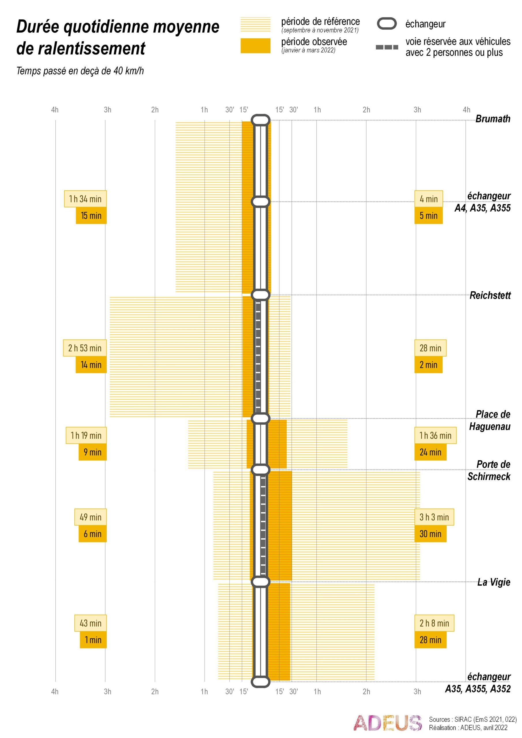 En outre, la préfecture estime que le GCO a permis de réduire considérablement le nombre et la fréquence des ralentissements (vitesse inférieure à 40 km/h) sur la M35. Selon des pointages effectués entre janvier et mars 2022, ces ralentissements ne sont survenus qu’une demi-heure sur le tronçon entre La Vigie et la Porte de Schirmeck, alors qu’ils ont existé pendant plus de trois heures sur le même tronçon entre septembre et novembre 2021. Même chose entre Reichstett et la place de Haguenau, où le temps de ces ralentissements aurait fondu de près de trois heures à 14 minutes (voir graphique ci-dessous).