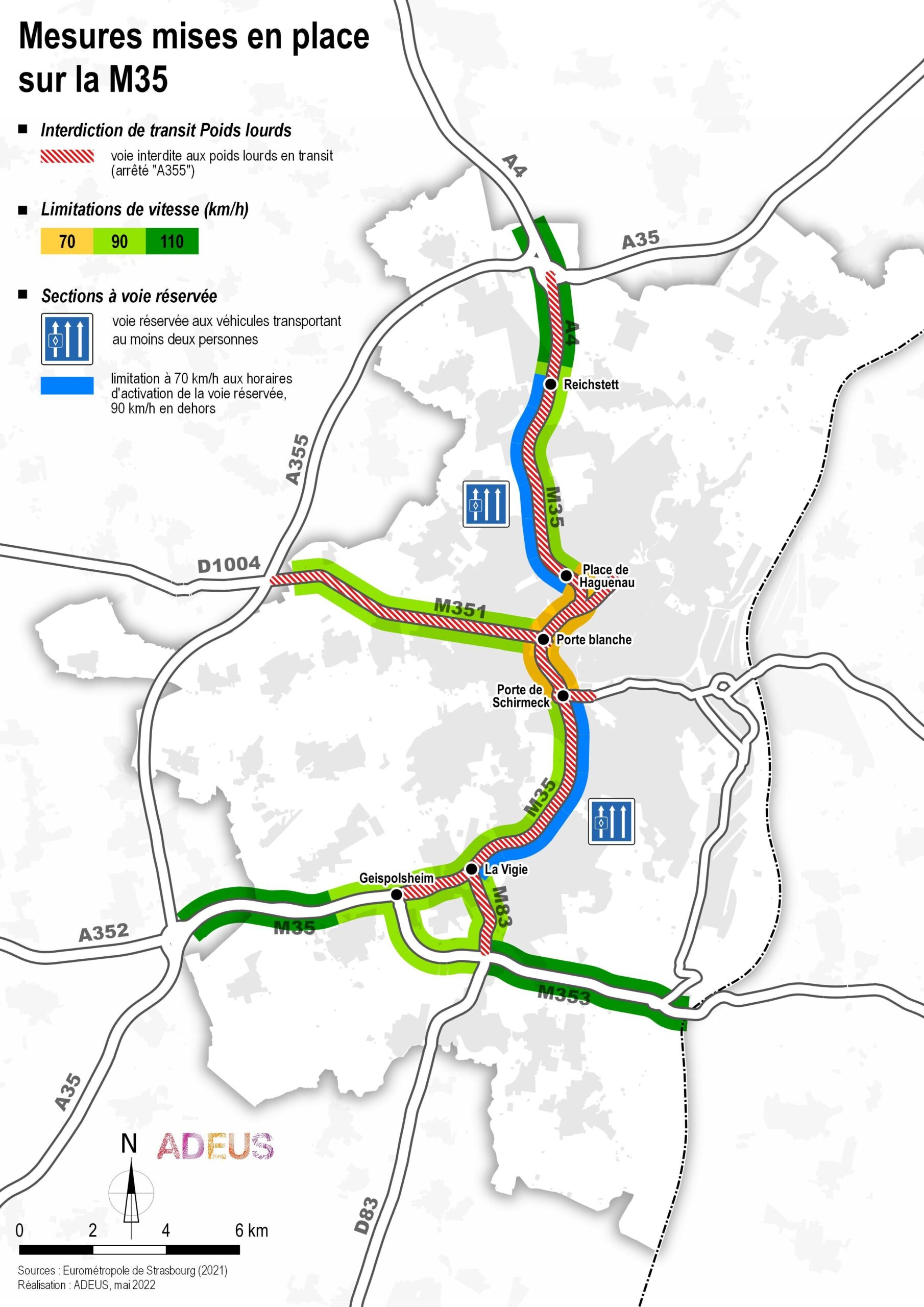 Afin d’éviter le report du trafic sur la M35, l’ancienne A35 qui traverse Strasbourg, les poids-lourds en transit (qui ne s’arrêtent pas dans l’Eurométropole) ont été interdits et la vitesse maximale a été abaissée à 70 km/h entre la place de Haguenau et la porte de Schirmeck, et à 90 km/h sur la rocade sud (M353) entre Geispolsheim et Fegersheim et la M351 vers Eckbolsheim (voir la carte ci-dessous).