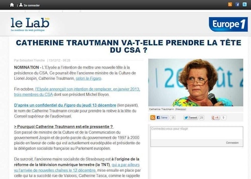 A LIRE SUR : LELAB.EUROPE1.FR On apprend ce matin à la lecture du site Le Lab d’Europe 1 que l’ancienne maire socialiste de Strasbourg et ministre de la culture et de la communication de Lionel Jospin Catherine Trautmann pourrait succéder en janvier prochain à Michel Boyon et prendre la tête du Conseil Supérieur de l’Audiovisuel. …