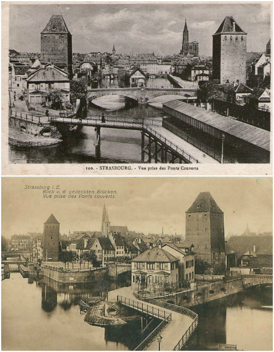A noter enfin que, sur ce pont (ou ces Ponts couverts), les Allemands installèrent le tramway au tournant du XXème siècle. Aujourd’hui, la quatrième tour, celle dite des Français, ne voit plus passer les trams, mais les vélos et les voitures, transitant pour les uns vers le quartier de la gare par les Ponts couverts, se rendant pour les autres au parking de l’Hôtel du département, qui se dresse depuis 1987 place du Quartier-Blanc.